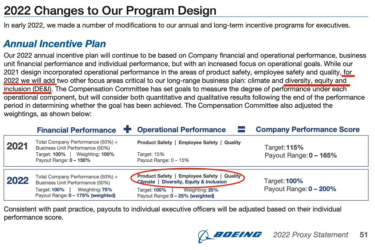 Up to 40% of the executives' potential pay is in that "annual incentive pay program" which is tied to hitting DEI targets. For those just catching on, DEI doesn't have anything to do with aircraft manufacturing or safety.