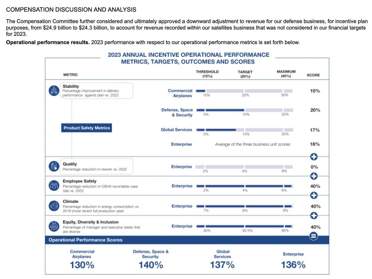 Here's the page from Boeing's 2024 SEC filing indicating they didn't meet production or quality targets but did meet ESG (climate) and DEI targets, demonstrating the misallocation of resources and priorities at the company. https://t.co/xq0hggkKrh