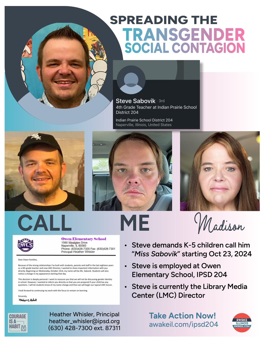 Ladies and gents, this is what government schools are now: transgender cultist training centers. Thanks to all of our “empathy and inclusion”, Steve felt bold enough to send out a letter demanding K-5 children call him a woman starting today, Oct 23. Then the schools sent out a letter so families can train their children to “watch their tonality and facial expressions” to make Steve feel comfortable and accepted. Literally they did this. Have you given enough “tolerance and kindness” yet? If this absolutely enrages you, hit this contact form and let them hear it. Thanks to our friends at @Awake_IL for setting this up: https://www.awakeil.com/ipsd204