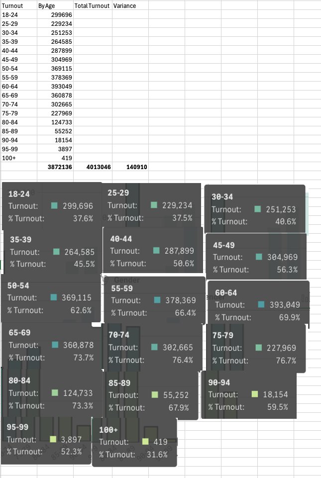 Well here it is folks - GA Data Hub has voters with NO AGE! Total Turnout -4,013,046 By Age -3,872,145 Extra 140K voters - By breakdown Last time I checked proof of ID with age was mandatory in Georgia. Right now. Check for yourselves๐` Election Data Hub - Turnout | Georgia Secretary of State (http://ga.gov)