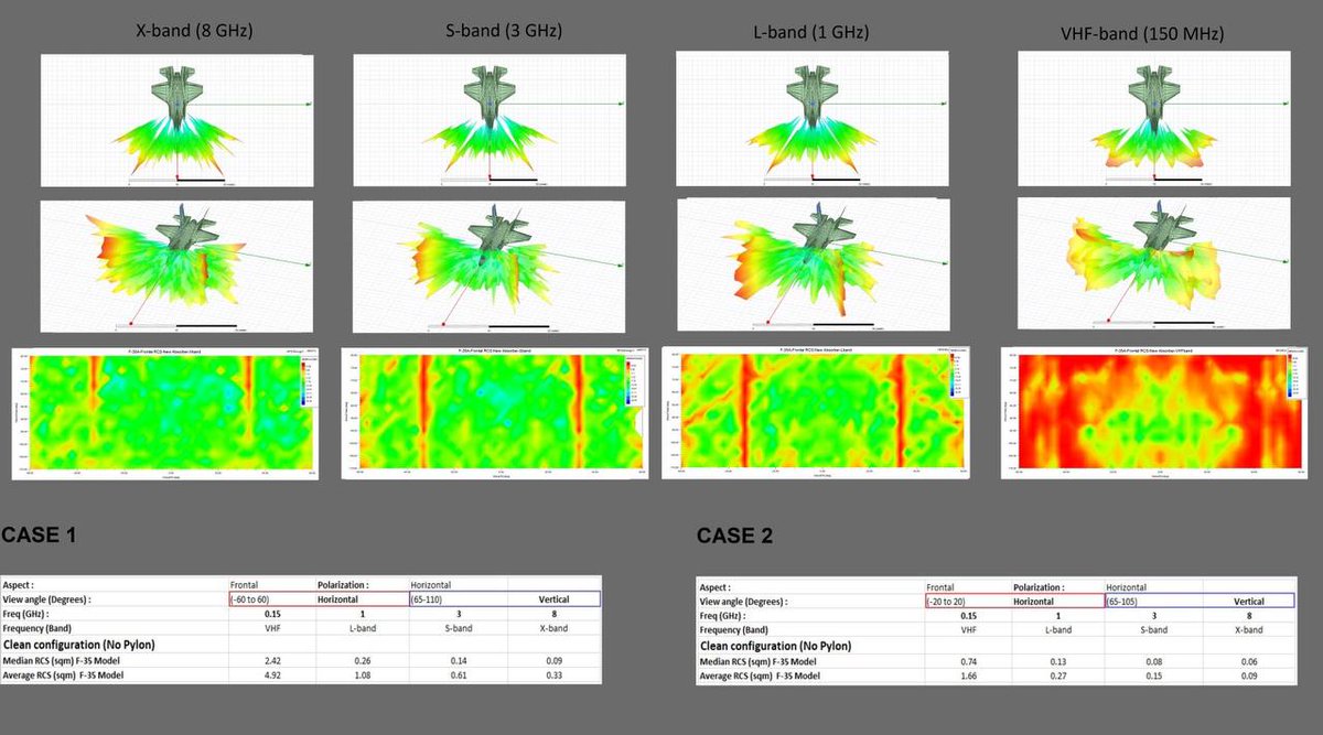 Iranian air defenses are likely able to detect and engage F-35 stealth fighters, according to recent tests In a recent exercise, the fire-control radar of Iran's 'Bavar-373' air defense system intercepted a 'Karrar' drone at a distance of 316 kilometers, with a radar cross-section of 2,14 square meters or 3.22 decibels. (Image of this interception attached above). It it is not clear at what range the initial detection took place, but according to this data, the fire-control radar of the Bavar-373 can detect a flying target with a radar cross-section of 0.01 meters from a distance of 82km, or a target with a radar cross-section of 0.05 meters from a distance of 123km. Now, let's assume that this system, the Bavar-373, is equipped with an L-band radar, for example like the TPY-4, and its detection capability is roughly similar to this radar. In theory, this means that the fire-control radar of the Bavar-373 is able to intercept an F-35 from a distance of up to 218 kilometers, given that its radar-evasive coating at this frequency (L-band) is practically negligible and the radar cross-section of the F-35 is approximately 0.5 square meters. Simulated examples of the F-35's radar cross-section at L-band and VHF frequencies is provided in the images attached to this post. To convert decibels within the 360-degree diagram (image also attached to the post) to square meters, which is of course the radar cross-section with the radar's horizontal viewing angle, use the following formula: 10 ^ (decibels/10).