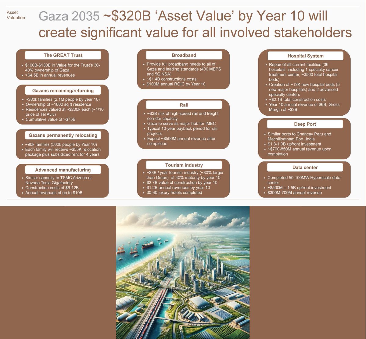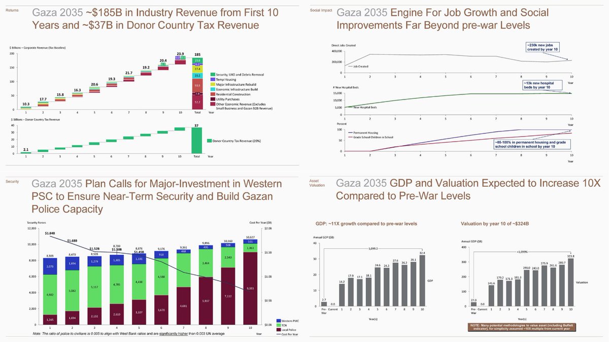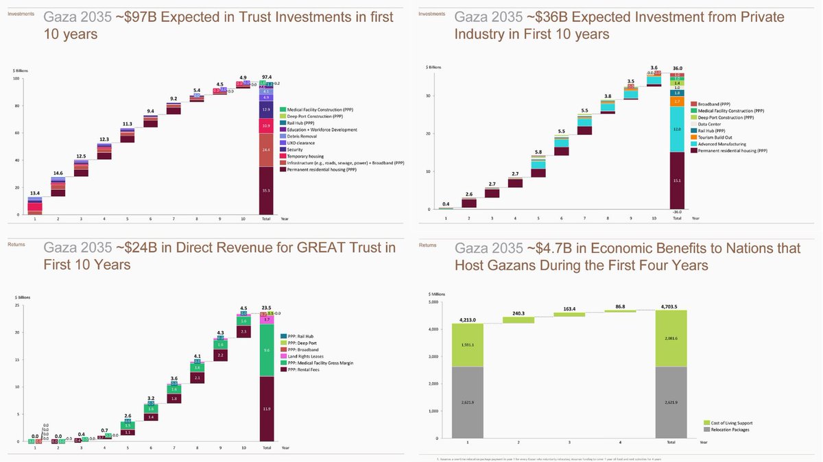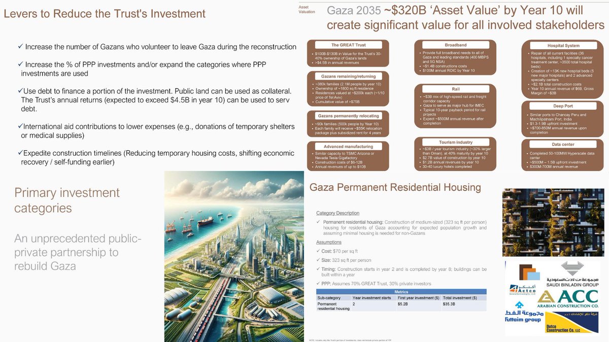 5. The Vision for Gaza 2035 is not just colonial, it’s profitable. By year 10, they expect the Strip to yield $320 billion in “asset value” across housing, ports, rail, and data centers. Here’s how they plan to do it and who benefits. The Core Mechanism: Public-Private Enclosure The GREAT Trust, a pseudo-sovereign entity backed by donors and Gulf investors, will own 30–40% of Gaza’s land and expects over $4.5 billion in annual revenue by year 10. The rest will be carved up by “private partners” in a sweeping PPP model (Public-Private Partnership). Asset Breakdown | Here’s what they plan to monetize: Housing: $35.3B in investment to build homes for ~2.1 million Gazans. Each home is pegged at ~$200K value, a tenth the cost of Tel Aviv real estate. Ports & Rail: $3B in transport corridors connecting Gaza to the IMEC corridor, with another $1.3–1.9B deep-water port linking to India. Data Centers: $500M–$1.5B in hyperscale infrastructure for cloud and surveillance operations, expected to generate up to $700M/year. Tourism & Manufacturing: 30–40 luxury hotels, “Gigafactory”-scale industrial zones, and broadband infrastructure intended to lure tech investment and reshape Gaza as a logistics and finance hub. 🚨 Profit Hinges on Depopulation To cut costs and raise per capita wealth, the Trust openly admits its investment is cheaper when more Gazans leave: “Increase the number of Gazans who volunteer to leave Gaza during the reconstruction.” Every 1% reduction in Gaza’s population lowers expenses by hundreds of millions. They plan for 90K families (500K people) to “relocate permanently,” with a $55K buyout per family — and no guarantee of return. Debt, Collateral, and Extraction: Public land will be used as collateral to secure loans. Aid is not a gift, it’s a mortgage. Gaza’s future is a financial instrument: Loans secured by confiscated or depopulated land Foreign aid used to subsidize private profit Construction timelines expedited to move quickly from crisis to cash flow This is not about rebuilding Gaza. It’s about flipping it like one of those shows on DIY network.