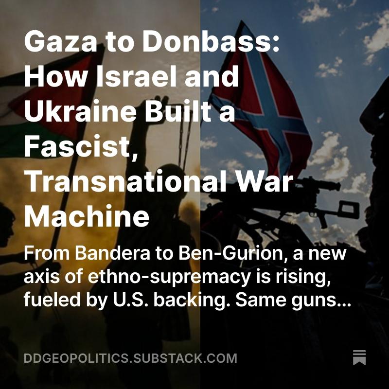 🇵🇸🇷🇺🚨 New SUBSTACK!!! Gaza to Donbass: How Israel and Ukraine Built a Fascist, Transnational War Machine Across two battlefields, one scarred by siege, the other by shelling, an unholy alliance of Zionist settlers and Ukrainian fascists wages a war against history’s unwanted. From IDF-trained Azov fighters and Israeli PMCs in Ukraine, to Ukrainian militants surfacing in militarized Gaza aid ops—this isn’t coincidence. It’s infrastructure. Palantir, Anduril, Elbit Systems. AI drones. Biometric fences. Shared ideologies. Shared enemies. Shared tools. In a West drunk on racialized supremacy and privatized war, these forces are not defending their nations. They are refining extermination.