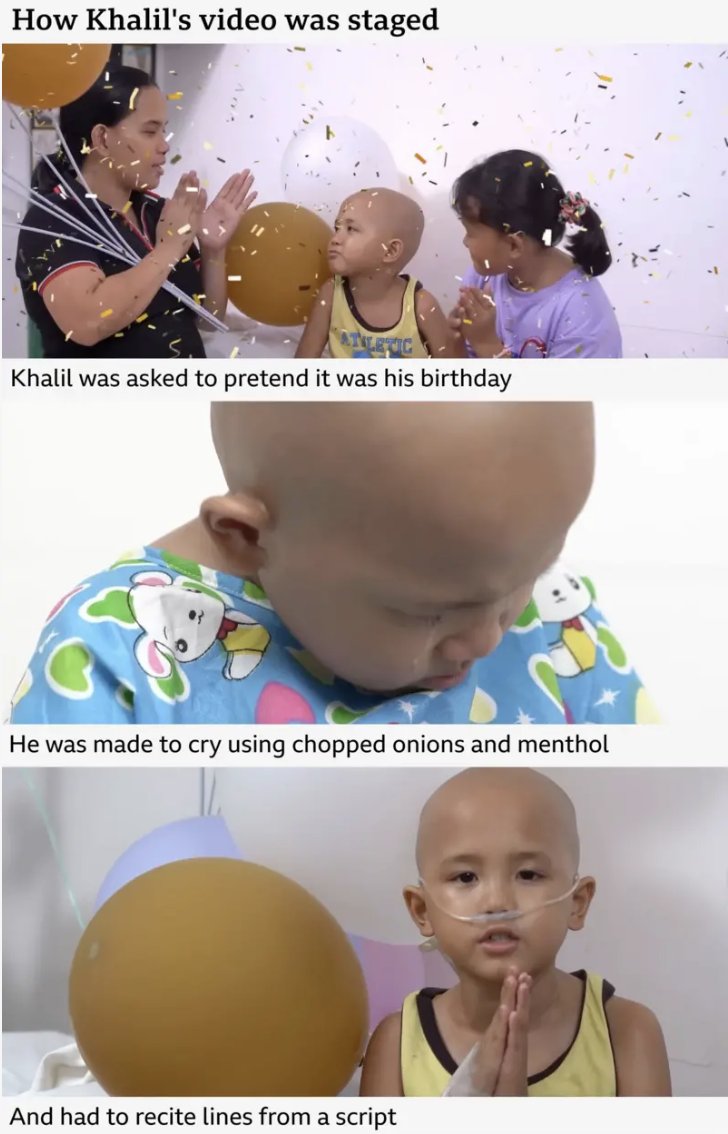 This is the tragic story of Khalil, a 7-year-old boy from the Philippines. His campaign raised over $27,000 from kind donors around the world. Khalil's mother, Aljin, met a man from Canada. She later recognised his photo as Erez Hadari, the central figure in this network.The family received only about $700 as a small "filming fee." Nothing more ever came for Khalil's treatment. To create emotional videos, Khalil's head was shaved bald. He was fitted with a fake IV drip. They used chopped onions and menthol to force tears. He was told to pretend it was his birthday party and recite scripted lines in English. Khalil died a year later without the care that money could have provided. Aljin said: "If I'd known how much money was raised, maybe Khalil would still be alive." Shockingly, donations continued to pour in even after his death. Hadari's only excuse was "high advertising costs – the company lost money." No real help ever reached the family. This was pure exploitation of a dying child.