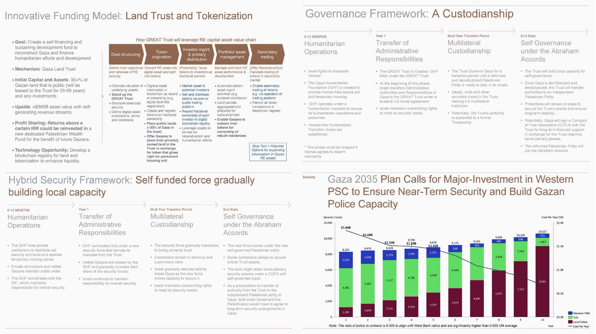 3. The core of the “GREAT Trust” plan is this: Gaza is not to be rebuilt for Palestinians but for investors. At its heart is a $300B+ Land Trust, funded by turning Gaza’s land into digital tokens, tradable on a blockchain, managed like a corporate asset: • Public land (~30%) leased for up to 99 years • Private landowners offered “permanent housing” in exchange for digital tokens • All transactions tracked via smart contracts • Land aggregated, securitized, and sold — piece by piece This is disaster capitalism on the bones of a genocide: 1. Tokenize the rubble. 2. Sell off the land. 3. Use the proceeds to fund a surveillance dystopia and call it “Palestinian Wealth.” Governance? Not democratic, but custodial: • Phase 1: Israeli-led “humanitarian zones” (no Hamas) • Phase 2: A multilateral Trust governed by U.S. and “friendly” Arab states • Phase 3: A deradicalized “Palestinian polity” takes over…but only if it signs the Abraham Accords. Security? It begins with Western PMCs, transitions to Trust-trained Gazans, but always under permanent Israeli “oversight rights.” This is worse than occupation, monetized, digitized, and whitewashed through humanitarian theater. And in the end, it forces Palestine into a Zionist normalization pact as the price of survival.