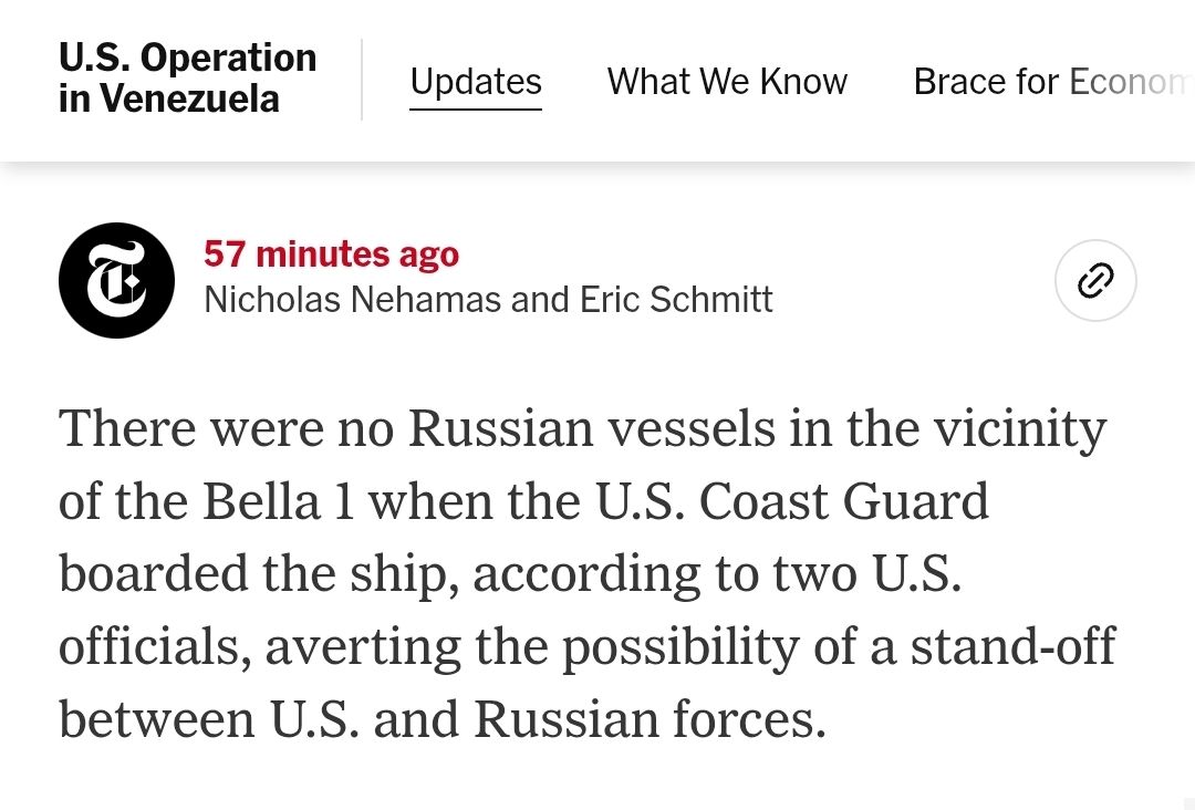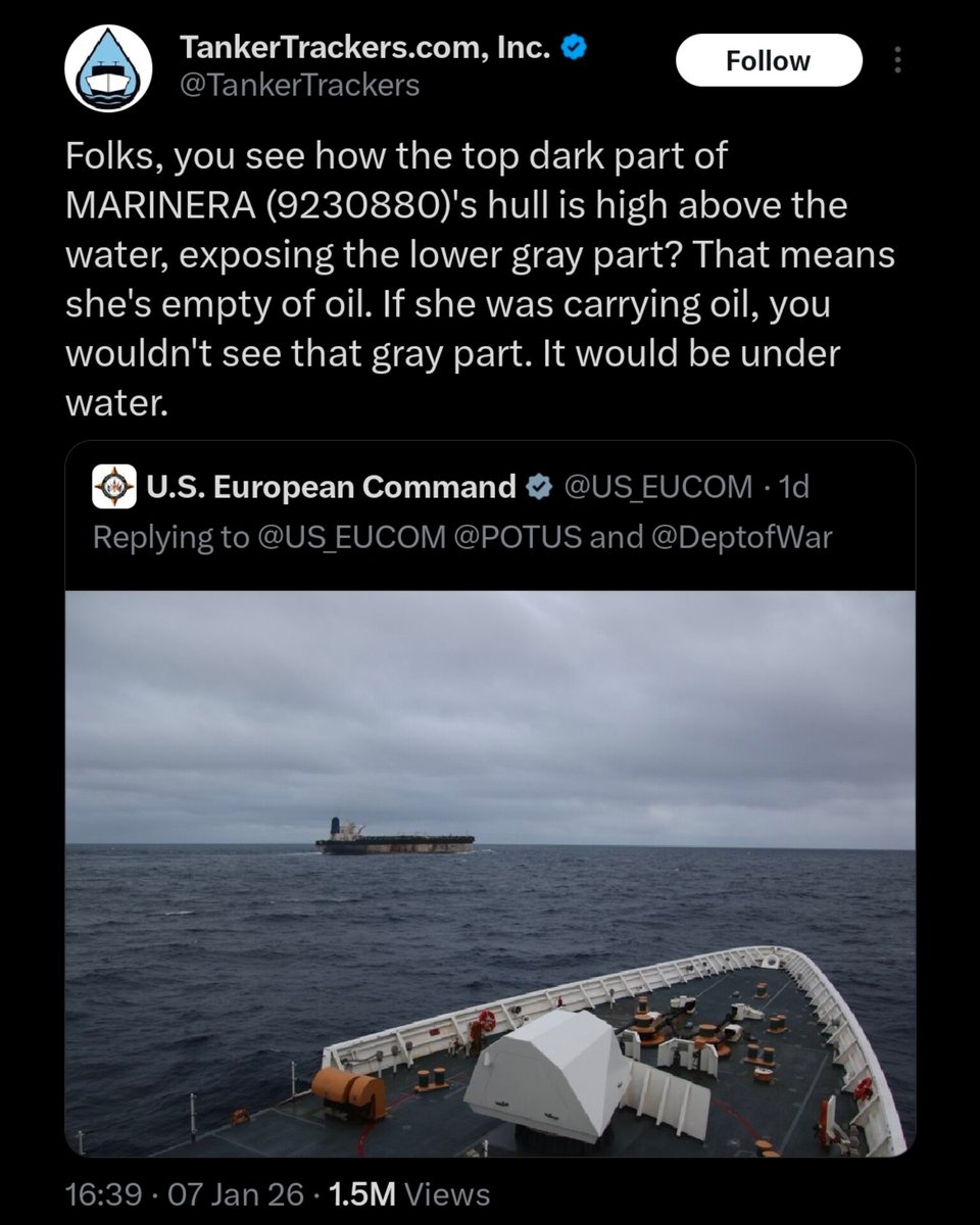 🇺🇸🇷🇺 It’s astonishing how effortlessly Donald Trump lies. He claimed that during the seizure of the Russian-flagged oil tanker Marinera, “Russian ships retreated very quickly” once the U.S. arrived. That’s a complete fabrication. There were no Russian ships in the area. The only claims suggesting otherwise came from Western media. Reuters’ assertion that Russian vessels were present was later debunked by multiple Western outlets themselves, all confirming that no Russian ships were anywhere near the tanker. Then comes the second, even more blatant lie: Trump said the oil was being unloaded. It wasn’t. The tanker was empty. This is clearly visible in the photo released by U.S. European Command, and it’s backed up by multiple media reports stating the same. Trump is operating inside a one-man propaganda bubble, spewing fiction for an audience of MAGA bootlickers who won’t question a word of it.