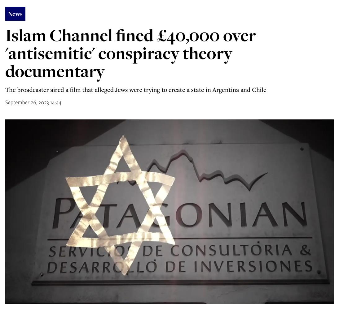 An Islamic Channel in the UK was FINED for Airing a Documentary on Plan Andinia!! In February 2021, the UK-based Islam Channel aired an hour-long documentary titled “The Andinia Plan.” The film alleged that Israel and Zionist organizations were pursuing a long-term plan to create a second Jewish state in Patagonia, spanning parts of southern Argentina and Chile. In 2024–2025, the UK broadcasting regulator Ofcom fined the channel £40,000, ruling that the program amounted to antisemitic hate speech and promoted an unsubstantiated conspiracy theory. The Islam Channel documentary framed the theory as possibly “re-emerging” in modern form, which Ofcom ruled crossed the line from analysis into collective suspicion of Jews as a group. They ruled that the documentary presented conspiracy as fact, implied collective Jewish intent, lacked historical context or rebuttal, and encouraged suspicion toward Jews as Jews. That is why it met the UK’s ridiculous definition of hate speech. Yet another topic we aren't allowed to discuss?