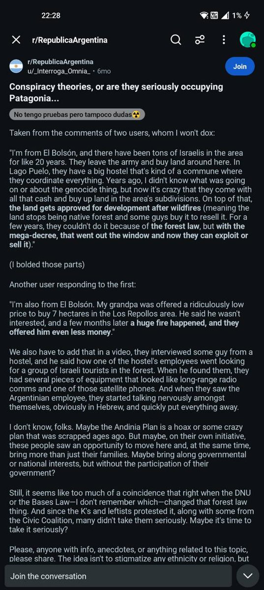 🇦🇷🇮🇱 Argentina, Wildfires, and the Return of Plan Andinia Argentina is burning. Massive wildfires are tearing through Patagonia, displacing communities and destroying protected land. As the fires spread, local residents have begun reporting something unsettling: foreign individuals caught allegedly setting fires, with multiple reports pointing to Israelis. Authorities say investigations are ongoing. Patagonia is not just wilderness, it is one of the most resource-rich, sparsely populated regions on Earth: • Freshwater reserves • Fertile land • Strategic geography • Low population density It is also a region that has long attracted foreign interest, legal and otherwise. This brings up a term many Argentines know well: Plan Andinia. Plan Andinia refers to a mid-20th-century geopolitical concept, discussed in Argentine military and intelligence circles, proposing the establishment of a Jewish state or autonomous zone in Patagonia under certain conditions. Whether speculative or strategic, it was real enough to be studied, debated, and feared. Plan Andinia was never implemented. But ideas do not need to be implemented to shape behavior. They need only to justify long-term positioning. Land acquisition, NGO influence, tourism corridors, dual citizenship flows, security cooperation these are far more common tools than tanks. Argentina’s south has seen: • Large-scale foreign land purchases • Restricted-access estates • Private conservation zones with opaque governance • Foreign security personnel operating under civilian cover Wildfires introduce a new variable that Israelis will love.... forced displacement. Throughout history, environmental destruction has often preceded land reorganization. Not because fires prove intent but because chaos creates opportunity: • Emergency powers • Property transfers • International “assistance” • Reframing of sovereignty as “management” There are credible reports of Israelis caught setting fires on the hiking trails of Patagonia. In 2011, an Israeli was caught setting a fire that burned 17,000 acres of Chilean Patagonia. When communities feel their land is being taken, reshaped, or destabilized without consent, they remember history. Argentina has its own history with foreign interference, IMF restructuring, and externally imposed “solutions.” In that context, Patagonia is not peripheral. It is strategic. And Plan Andinia persists not as a plan, but as a symbol of vulnerability. Wildfires should unite a country in defense of its land, not silence discussion. History doesn’t repeat verbatim but it rhymes, especially when land is burning. And everything is a conspiracy.... until it isn't....