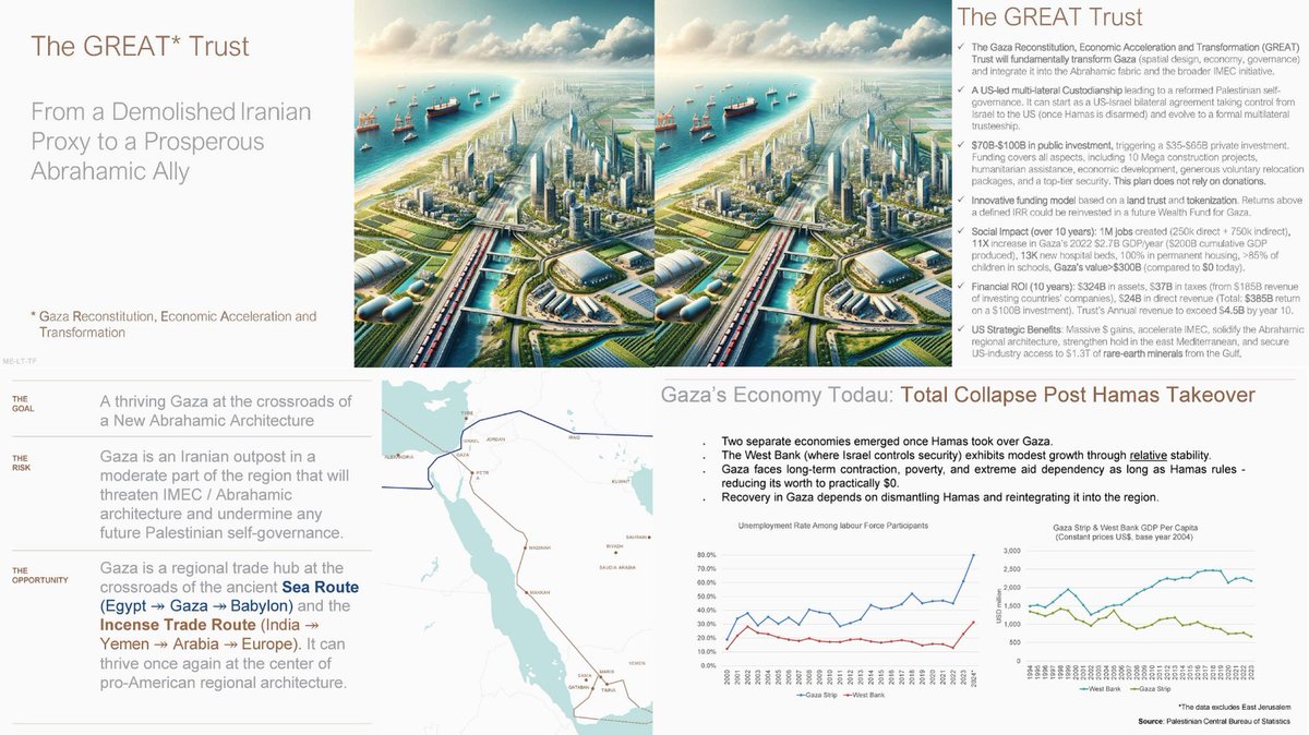 🇵🇸💸 Welcome to “The GREAT Trust” — Gaza’s future as imagined by U.S. planners, Israeli strategists, and Gulf investors. A corporate utopia, built on ruins and wrapped in Abraham Accords buzzwords. But under the branding lies a brutal truth: Gaza is to be recolonized, monetized, and erased. This is not a reconstruction plan. This is a capitalist cleansing operation. A leaked document titled “The GREAT Trust”—short for Gaza Reconstitution, Economic Acceleration, and Transformation—lays out the blueprint. It envisions Gaza as a “thriving trade hub” at the heart of the new Abrahamic regional order. But that vision only begins after Gaza is destroyed, Hamas is dismantled, and U.S. control is imposed through a “multilateral trusteeship.” This is how they describe it: “A U.S.-led custodianship… can start as a U.S.–Israel bilateral agreement taking control from Israel to the U.S. (once Hamas is disarmed), and evolve into a formal multilateral trusteeship.” The real goal? Transfer Gaza from Israeli occupation to U.S.-Arab corporate control. 📉 Gaza’s value under Hamas is described as “$0.” The West Bank, they note approvingly, has “modest growth” under Israeli control. The conclusion? Hamas must be dismantled, Gaza must be opened to foreign capital, and “voluntary relocation” must begin. 📈 What follows is a $70–100B investment scheme to kickstart tokenized land ownership, 10 “mega construction” projects, a “top-tier security force,” and massive returns for U.S.-aligned investors: $385B projected ROI over 10 years $324B in asset value $37B in tax revenue (for foreign countries) $24B in direct revenue Annual trust income exceeding $4.5B by Year 10 Gaza, they claim, will become a “$300B asset” up from “zero.” A digital-physical economic zone at the center of the IMEC corridor, exporting labor and goods through tokenized land and tightly controlled trade routes. But this wealth will not belong to Palestinians. The plan mentions “generous voluntary relocation packages” and “permanent housing,” but offers no political autonomy, no elections, no justice. Just corporate trusteeship, strategic mineral access, and a chance to erase Gaza’s revolutionary spirit forever. 🧵This is the vision. This is The GREAT Trust. A capitalist dystopia over the bones of children.