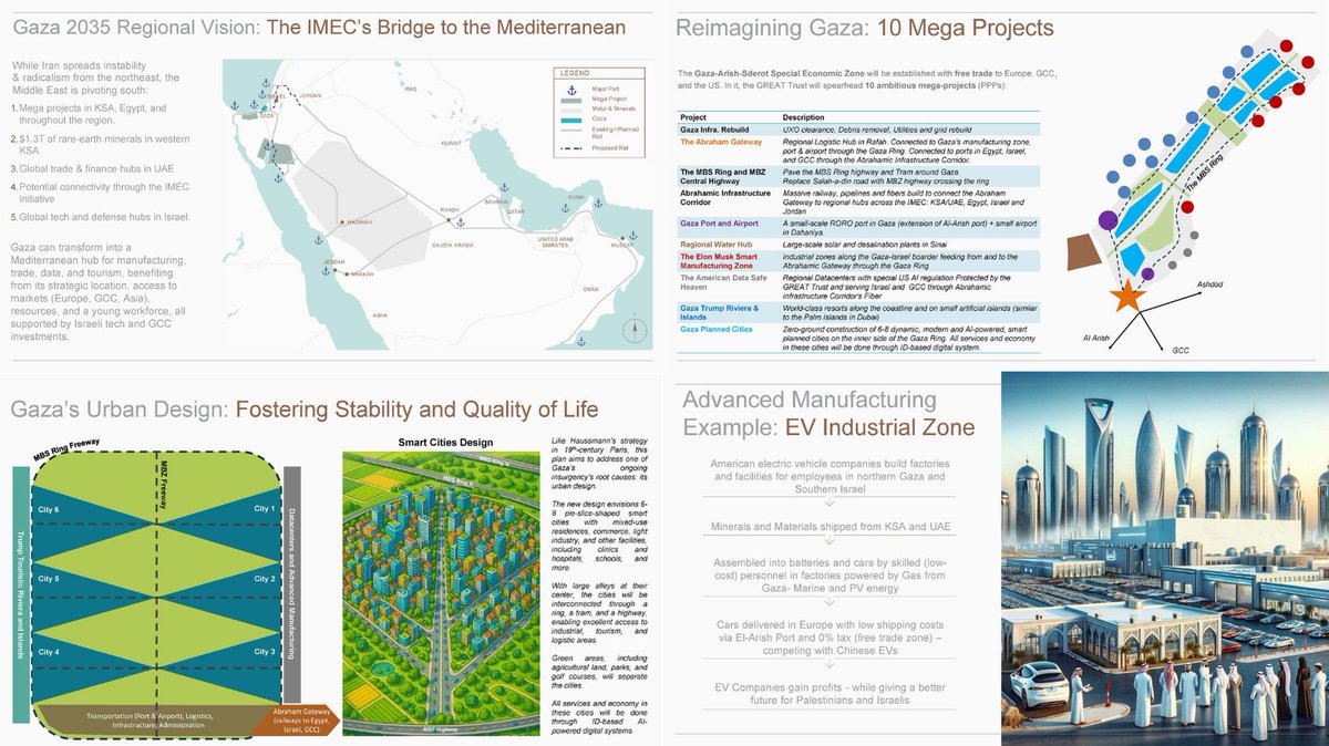 2. The plan to “rebuild Gaza” is a corporate-military annexation wrapped in buzzwords like resilience, integration, and smart cities. By 2035, Gaza is envisioned not as a Palestinian homeland but as: • A bridge between India and Europe for the IMEC trade route • A rare-earth processing hub feeding Gulf tech and Israeli defense • A walled free-trade zone ruled by digital ID and AI systems The U.S. and Israel would direct a 10-part mega-project campaign: 1. UXO/demolition clearing 2. “Abraham Gateway” logistics node in Rafah 3. UAE/KSA-funded railways, ports, and pipelines 4. An “Elon Musk Smart Manufacturing Zone” for EVs 5. U.S. datacenters governed by AI laws 6. A Trump-branded island resort 7. Smart ID-governed cities designed for surveillance 8. Israeli-border industry zones powered by Gaza’s own gas 9. A regional water hub (Sinai-based desalination) 10. A highway grid to link all of it to Israel, Jordan, Egypt, and the Gulf Like Haussmann’s redesign of Paris to crush rebellion, Gaza’s new layout is engineered to prevent uprisings before they begin. All economy, services, and movement would run through AI-managed ID systems. The cities are shaped like pie slices, surrounded by golf courses and tourist zones, with trams, highways, and surveillance nodes connecting every edge. This is late-stage capitalism on meth and ketamine....