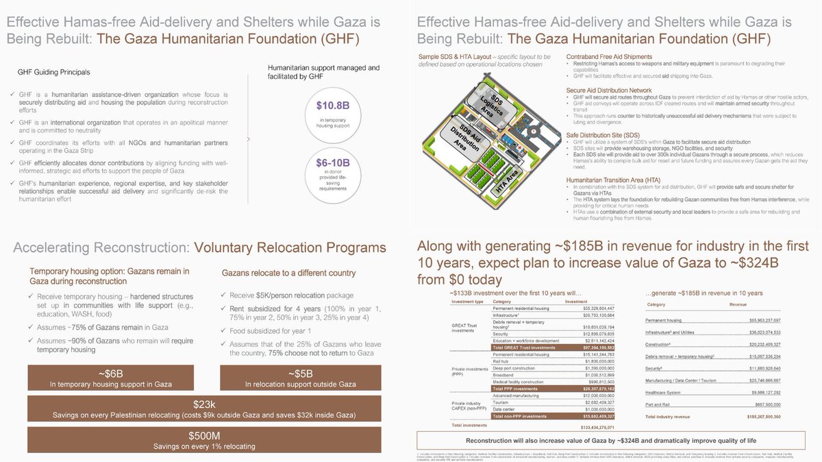 4. The Gaza Humanitarian Foundation (GHF) calls itself neutral. It is not. It is the logistical arm of a militarized, investor-led occupation, designed to control aid, manage population flows, and pave the way for a for-profit reconstruction model — all while claiming apolitical “humanitarianism.” Let’s break it down. The Business Model: GHF’s reconstruction plan involves $133B in investments that are expected to generate $185B in revenue over ten years largely by privatizing Gaza’s core infrastructure: • Housing • Security • Broadband • Education • Medical services • Data centers and manufacturing hubs • Even debris removal This is an asset extraction scheme. Gaza becomes a closed-loop contractor economy, where every bombed building and displaced family becomes an investment opportunity. 🚧 Controlled Aid, Militarized Zones (Concentration Camps) GHF proposes a “Safe Distribution System” (SDS), not for all Gazans, but for carefully screened recipients routed through military-grade checkpoints. • Aid convoys operate only on IDF-cleared roads • “Safe Zones” are surrounded by Israeli and private security • Aid delivery is designed to bypass Hamas and local civil society • All activity occurs under surveillance and armed oversight Voluntary Relocation = Ethnic Cleansing The plan’s most disturbing section outlines a “Voluntary Relocation Program.” It assumes that 25% of Gaza’s population will leave the Strip, and that 75% of those will never return. Here’s the math: • $5,000 payout per person • Rent and food subsidized for 1–4 years • ~$500M saved for every 1% of the population relocated • Estimated total savings = billions GHF frames this as choice. But in a decimated homeland, with no guarantee of safety or rights, it’s not choice. It’s financially incentivized expulsion. The final goal? To increase the land value of Gaza from $0 to $324B. To create a digitally tokenized, foreign-managed microstate stripped of resistance and filled with profitable security contracts. The GHF is not a relief group. It is an evangelical corporate intermediary for regime change, spatial cleansing, and wealth extraction.
