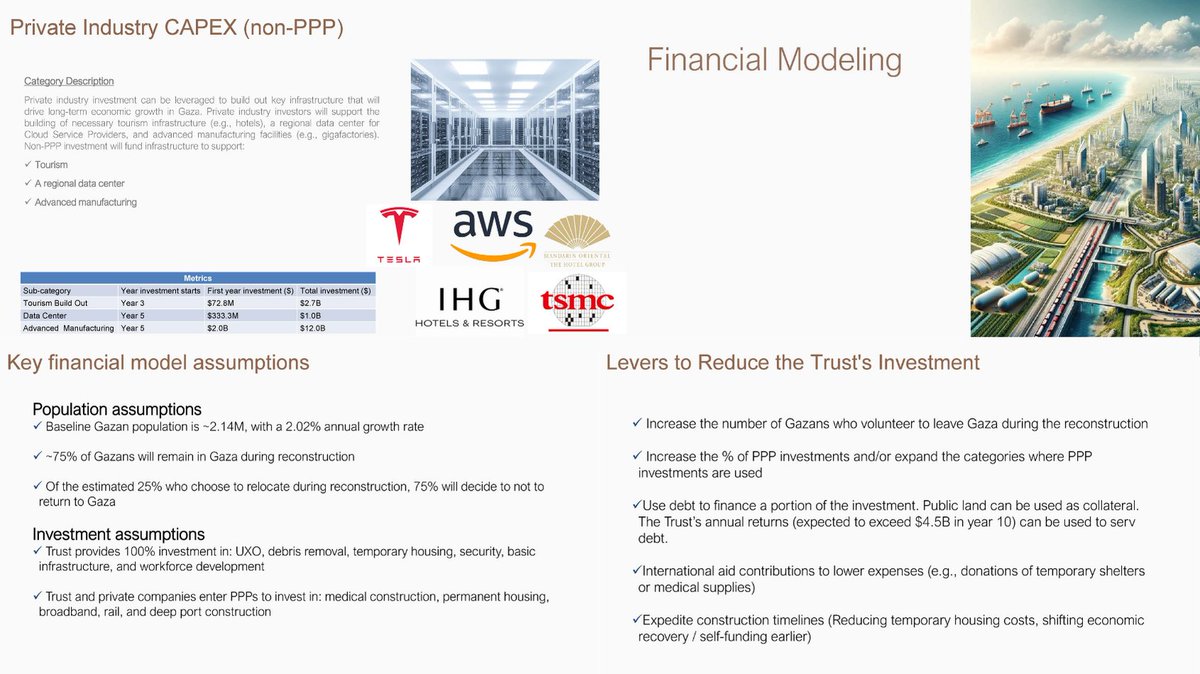 6. Gaza is being refashioned into a privatized dystopia where foreign corporations extract value, public land becomes collateral, and expulsion of Palestinians is an economic strategy, not a side effect. 🏨 Private Industry Targets (Non-PPP) | The plan encourages direct investment from multinationals outside of the public-private trust structure: - $2.7B for luxury tourism, hotels, and resort districts - $1B for hyperscale data centers for surveillance and cloud services - $12B for “advanced manufacturing” i.e., sweatshop-scale gigafactories 🚨 Featured firms: Tesla, AWS, TSMC, IHG, and Mandarin Oriental are all suggested as model investors. 📉 “Levers” to Reduce Investment Risk | Lists five ways to reduce their own financial burden and all of them come at the expense of Palestinians: - Increase voluntary displacement.More Gazans leaving means fewer services and homes to build. - Use more PPPs. Privatize sectors like medical care and broadband to shift costs to corporations. - Collateralize land.Public land can be used to take on debt and fund construction turning Gaza into a speculative asset. - Use humanitarian aid as subsidy. “Donations” of medical supplies and shelters let corporations profit without paying full costs. Accelerate construction. Speed is key: less time in temporary housing = more savings + faster revenue. Underlying Assumptions: - 25% of Gazans will “choose” to leave - Of those, 75% will not return - Remaining 75% are locked into this system with their land either privatized, mortgaged, or fenced off A forced exit strategy + economic enclosure, wrapped in a tech-utopian fantasy, funded by aid, and pitched to Western investors as a once-in-a-generation real estate opportunity.