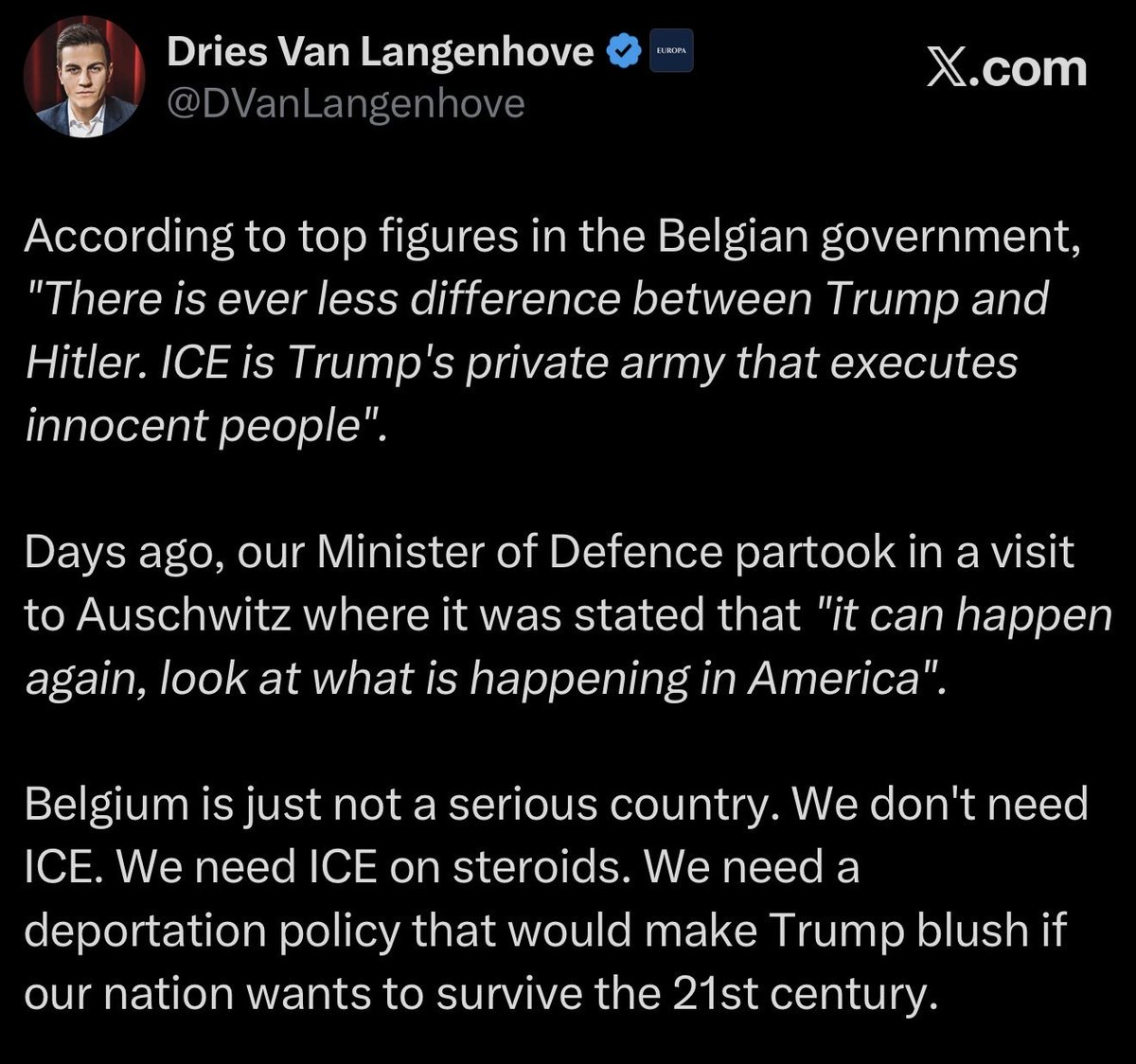 I am being severely threatened by the Belgian Ministry of Defence to delete this tweet. The threat, for anyone who can read between the lines, is that they will make it impossible for me to get asylum in the U.S. To be clear: I'm not planning on applying, but given that the Belgian regime is trying very hard to imprison me, they know that this is a possible escape. My conscience wanted to refuse their demand, but my brain decided to comply. Eight years of lawfare and state terror have bled me dry. I have to pick my fights carefully. So I deleted the post. Then it appeared deletion wasn't enough. The threats continued. Now they demand that I post a retraction. I will do no such dishonourable thing, as the tweet is correct. I will provide all the details so the facts are clear to everyone. The first quote is by Conner Rousseau. He is the president of the governing Socialist Party and without any doubt one of the most powerful politicians in the country. He is a political and personal friend of the prime minister. The second quote is by An Lemmens, a famous media personality that went along with MoD Theo Francken to Auschwitz. The segment on national television included a statement by her and a statement by MoD Francken. I did not mention her name because it is irrelevant to my international audience. What is relevant, is that the War Heritage Institute, which falls under the authority of the Ministry of Defence, brought along a media personality to severely slander the U.S.A. and its president Donald Trump. Equating America's migration policy to the Holocaust is both insulting to the rightful desire of the American people for strong borders and sovereignty and insulting to all those who suffered horrors in the Holocaust. The fact that the Minister of Defence and his cabinet, who are always keen, 24/7, to make statements about the most trivial things, are now completely silent about this abhorrent statement, made on a trip organised by one of their Ministry of Defence branches and propped up by the presence of the MoD himself, is shameful and cowardly. The current narrative in the Belgian MSM (subsidised by the government) is that Trump is Hitler and ICE are nazi's. Instead of going against this, the MoD was happy to get some publicity and chose not to challenge this insane narrative that was reinforced during the trip. My tweet was thus 100% correct. The MoD could have gone against the anti-American narrative and denounce the abhorrent statements made by his travel companion, but instead he chose to threaten and silence me so that he won't get any difficult questions from American allies. If you got here, please retweet. Only public pressure can protect me against their threats. I am not suicidal.