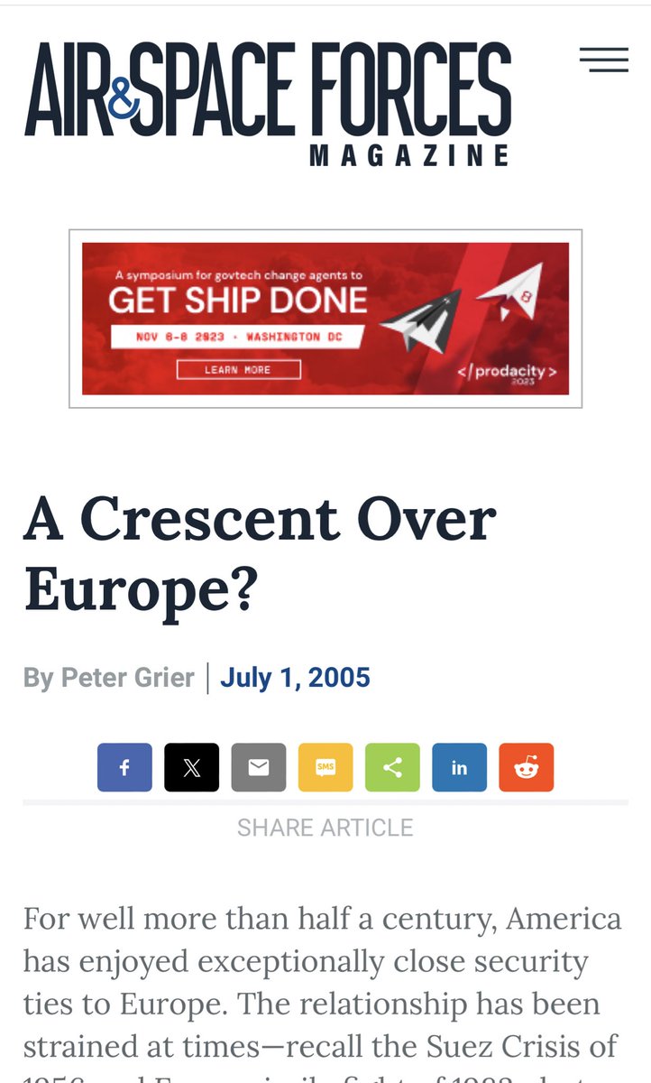 â(âŠ) Au mĂȘme moment, dans sa cĂ©lĂšbre revue Air Force Magazine, lâarmĂ©e amĂ©ricaine dĂ©crit les bouleversements dĂ©mographiques de lâEurope et annonce, sous le titre : « A Crescent over Europe ? », le probable basculement de civilisation, avec un banc-titre spectaculaire : « Le changement dĂ©mographique pourrait transformer le centre de la culture occidentale en un bastion islamique. » Le journal allemand Die Welt a publiĂ©, Ă lâĂ©tĂ© 2005, un entretien choc avec Bernard Lewis, lâĂ©minent professeur de lâuniversitĂ© de Princeton, islamologue mondialement reconnu. Il prĂ©dit : « LâEurope deviendra une partie de lâOuest arabe, du Maghreb. » Et de conclure : « LâEurope deviendra musulmane avant la fin de ce siĂšcle, au plus tard. » Quant au grand historien N. Ferguson, de lâuniversitĂ© de New York, il rĂ©sume ainsi la situation : « Tout lâouest de lâEurope est entrĂ© dans une nouvelle Ăšre de transformation dĂ©mographique sans Ă©quivalent Ă lâĂ©poque moderne. » Le 10 janvier 2006, le chef religieux des musulmans de Bosnie, le mufti Mustafa Ceric, a appelĂ© lâEurope Ă sâouvrir davantage Ă lâislam, en ajoutant, sous forme dâavertissement : « LâEurope nâa pas dâautre choixâŠÂ » Ce propos comminatoire balise ainsi le chemin quâon lui propose avec une insistance menaçante.â