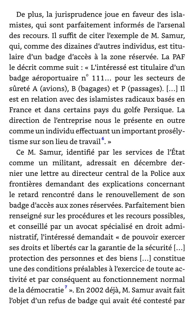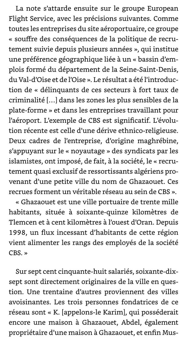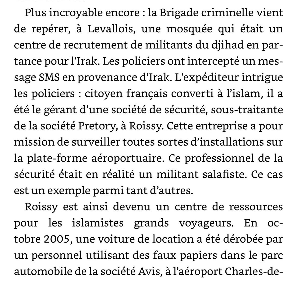 đ Ă Roissy, Ă lâĂ©poque de la rĂ©daction du livre, 43% des employĂ©s sont musulmans et mĂȘme 60% sur les pistes notamment Ă cause de la discrimination positive qui incite Ă embaucher dans les banlieues. đ On comptabilise Ă lâĂ©poque 52 lieux de priĂšres islamiques officiels ou clandestins đ Et quand les services veulent enlever un badge dâaccĂšs Ă un islamiste⊠les juges les en empĂȘchent. Et quand ça fonctionne il nây a quâĂ changer dâentreprise prestataire pour retourner travailler Ă lâaĂ©roport.