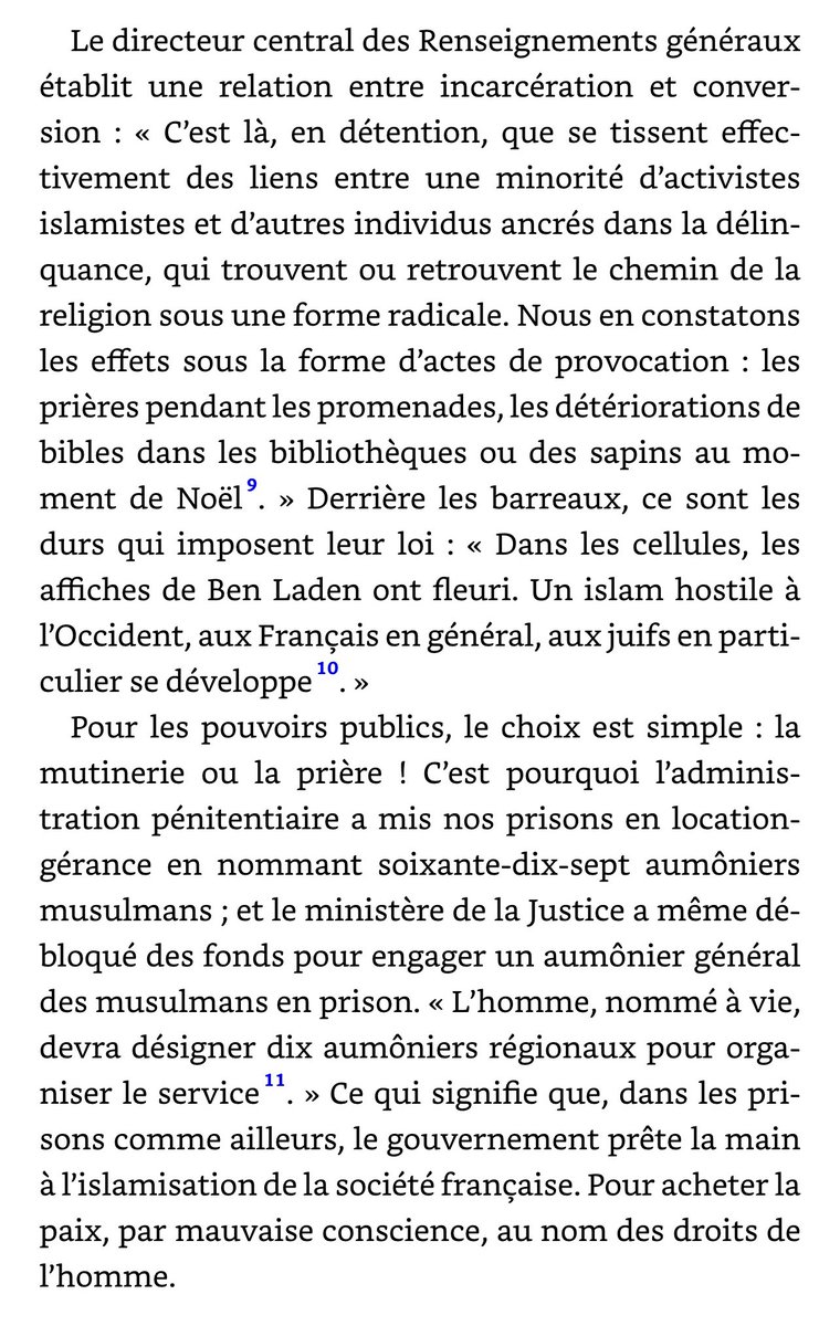 Deux sources anciennes mais utiles que le livre rappelle sur lâislam en prison : « Alors que les musulmans reprĂ©sentent moins de 10 % de la population française, ils sont 50 % des soixante-quatre mille dĂ©tenus, voire plus de 70 % dans les maisons dâarrĂȘt proches des banlieues. » JDD, 19 juin 2005. « Lâislam est dĂ©sormais la religion majoritaire en prison (de 50 Ă 80 %) » LâExpress, 15 mars 2004.