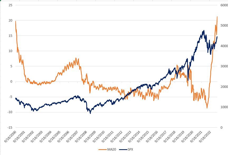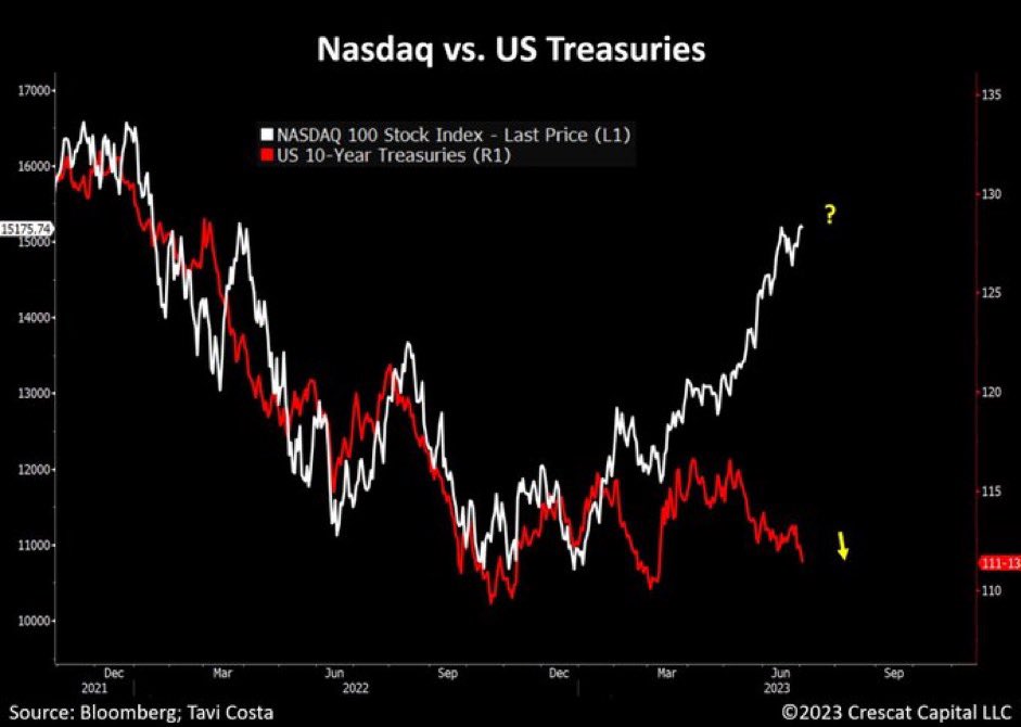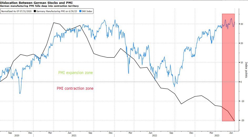 🚨Is the liquidity crisis about to hit and #stocks bids evaporate?🚨 @SpyMasterTrades post the other day inspired me to look deeper into the behaviour of the spread between $SPX front and second $ES futures. I got some interesting things out of it 👀 Charting the 20MA on the weekly and daily you can see that while the spread is a poor indicator to track $SPX long term trends (flat between 2008 and 2016 while the bull was running free), it it is instead a damn good indicator of the liquidity being drained or injected by central banks in #stocks ⚠️ While in the pre-covid era the beta between Fed Funds and this indicator was close to 1, we can clearly see a big spike after 2021 and Beta going well above 1. What caused that? 1- Fiscal stimulus boost effect fading 2-QT (FED stopping monetising US Debt) at the same time. The combination of the 2 factor is likely resulting in a liquidity drain from the market far greater than what #stocks are pricing. 😨 If we zoom in focusing on the past year, you can clearly see how the indicator tracked well the liquidity injected during the #BankingCrisis waves of March ( $SIVB) and May ( $FRC). But the indicator is telling us another thing, #stocks rally since May 2022 (when the indicator as well exactly bottomed) happened during a massive liquidity drain from the system. 🚨This has been a characteristic that anticipated every single market crash since 2000, a clear indicator of #FOMO and bubble exuberance. 🚨 While before it took far less liquidity drain to pop those bubbles, because less was injected prior to them forming, this time the drain is massive and well above what people are pricing off FF tightening effects (that have 12-18m lag) Summing all up, the run from May 2022 might have inflated the biggest bubble of all. This disconnect between #stocks and real economy is well portrayed by other indicators like the divergence between Treasuries and #QQQ (credit to @TaviCosta )or the divergence between the #DAX and German PMI. How far are we from the big bust? Considering how steep is the 20MA of $SPX futures spread and how wide is the disconnect with the real economy I fear we are pretty damn close 🥵