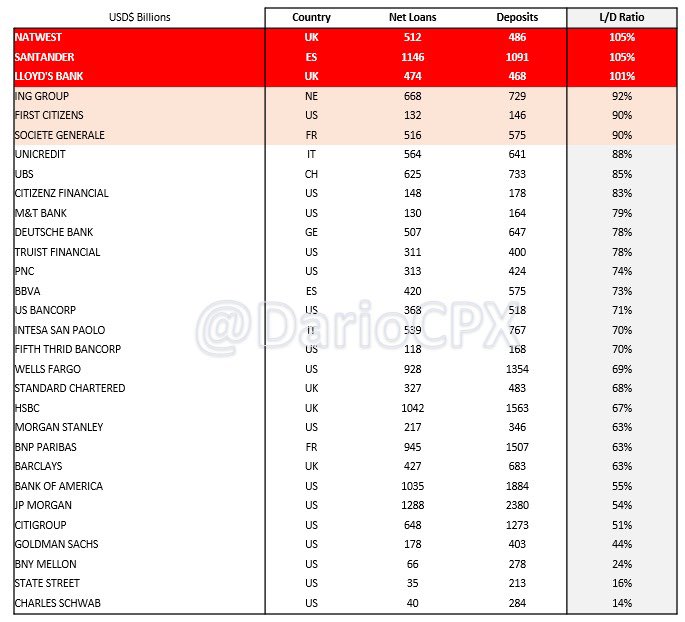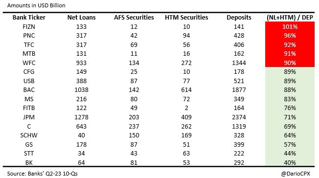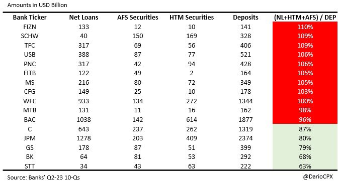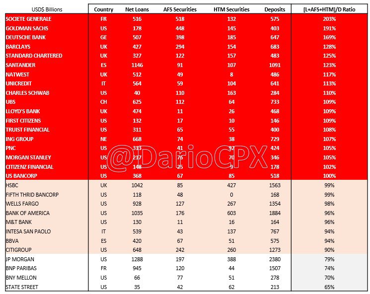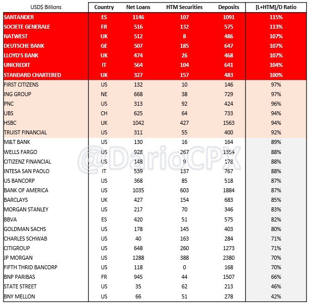 #JustDarioDaily 🚨 WHICH BANKS ARE AT RISK OF GOING BUST IN A LIQUIDITY CRISIS BECAUSE ALREADY (RIDICULOUSLY) INSOLVENT? 🚨 Thank you for waiting, but I assure you what follows isn't going to disappoint you! 😁 Two months ago in "This time is NOT different - Part 2," I flagged how my analysis at that time flashed (big) red warnings on several US banks (https://x.com/dariocpx/status/1706274260489228552?s=46&t=Hz7-qku8ZNVPw6L9nBJOZA). My analysis today will expand on the methodology presented (https://x.com/dariocpx/status/1706274251727409331?s=46&t=Hz7-qku8ZNVPw6L9nBJOZA) to include the following points: 1 - I will now include the largest European banks. Consequently, I reclassified their figures to harmonize all the datasets on US reporting. In particular, with regards to Available For Sale (AFS) and Hold To Maturity (HTM) securities. 2 - All values presented are in $USD. Non-USD figures have been converted using the 30th September FX rate for consistency. 3 - Shareholders' Equity is considered in its entirety. Now that the stage is set, the show can begin! 🎬 ⚠️ LOAN / DEPOSIT RATIO A L/D ratio above 90% is already a warning sign, but there are 2 banks that managed to lend more than the deposits they collected! (Table 1) ⚠️ [LOAN + HTM] / DEPOSIT RATIO HTM books are now officially "Hide to maturity" and stuffed with assets trading at a significant loss because of high interest rates (and soon high credit losses too). Not only banks cannot afford to sell those securities, but trading at such a discount to the par value, they even stop being collateral-worthy. Effectively, the risk of those books is now equivalent to the loan ones. Furthermore, bear in mind there is no #BTFP in Europe, while in the US, that only applies to US Treasuries or government-guaranteed securities. Now, check how many banks hold more highly illiquid assets than the deposits they collected...(table 2) I feel now the warning bells in your head are already pretty loud 😂 ⚠️ [LOAN + HTM + AFS] / DEPOSIT RATIO AFS securities aren't Marked to Market but booked according to their "fair value." Translated, their real value in the market is lower due to a lack of liquidity. Now, check how many banks cannot cover their deposits if we include the AFS assets in the analysis... (table 3) I bet now those bells in your head turned into a Marilyn Manson concert! 🤣 At this point, I hope you agree with me that all those capital ratios and risk metrics the regulators use to assess banks' health are completely useless. As a matter of fact, banks that went bust always had "strong capital" according to the regulatory metrics, from #CreditSuisse (recently) to #Lehman in 2008. Fyi, both banks imploded with an "A" rating! 🙈 🚨 Alright, now is time for fireworks! 🚨 In the last table, I present two scenarios on the current state of banks’ books: 1 - "La La Land" that only assumes 5% losses on loans, 10% on HTM, and 2.5% on AFS books and compares those with the bank's total equity. 2 - “Soft Landing" that assumes 7.5% losses on loans, 20% on HTM, and 5% on AFS books. I wanted to include a "Realistic" one, but my heart ❤️ couldn't bear it, sorry. 🥲🙏🏻 Feel free to play with the data and see what happens if you assumes realistic losses.. Considering how twisted the reality we are living in is, I used green crayons to mark all those banks that have high chance of being already insolvent in the “ridiculous” scenarios presented. 🤭 ⚠️Important to bear in mind is this analysis only considers on-balance sheet items to limit its complexity. However, if we bring in off-balance sheet items I strongly doubt banks like $BAC , $UBS and $HSBC will come up so strong as per previous detailed analysis I posted… Beware, during a financial crisis, all the assets, including "cash and equivalents," suffer a haircut while liabilities only get a haircut 💇 after a company files for Chapter 11. This means that the chances for the assets I left out to be able to increase in value during a crash to compensate for the calculated losses are close to zero. THE END 🎇🎆