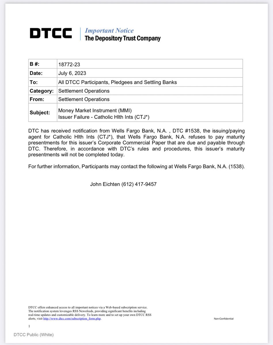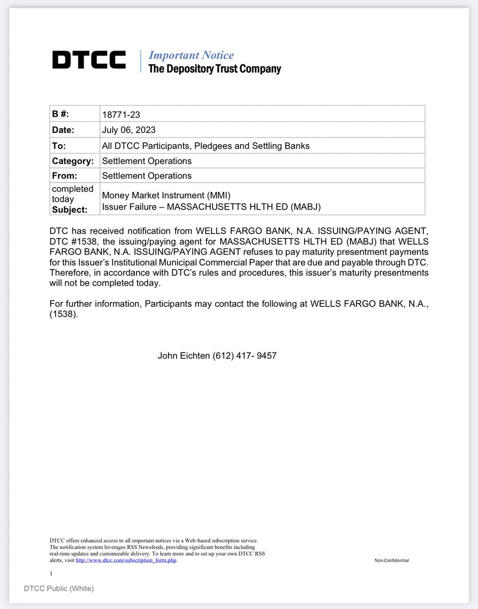 Troubles in the Commercial Papers market starting to escalate? 😨 🚨Liquidity crisis might be starting to seriously bite 🚨 I wonder how many noticed that yesterday $WFC notified the #DTCC of not 1, neither 2, but 3 issuer failures! ⚠️ 👀 You think this isn’t a big deal? I went through the archive and there was no triple filing to the #DTCC in a day in the past 5years while only 3 times there was a double filing in a day.. 😐 Cannot go further back in time, but I clearly remember when #Lehman started filing MMI failures in 2008 and when it escalated everyone realised the GFC nuke was about to blast 🫣