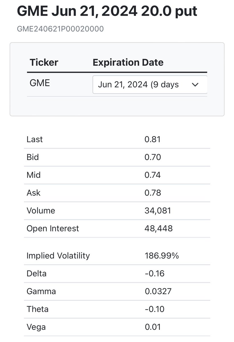 The more you dig the more you find…. 👇🏻🙈 Of all the deep ITM puts available on $GME with expiry 21 June, what are the chances the 20$ strike ones suddenly see an outsized jump in volumes today and their price closes Unchanged despite the stock being down ~16%? Open: 0.81, low: 0.29 Close: 0.82 Tell me you shorted 20$ calls, bought puts in size (hence you got discounted) and then you wash traded the first lower and the second higher, without telling me 🤭 Translated: what you see there is a “milking” of @TheRoaringKitty positions….