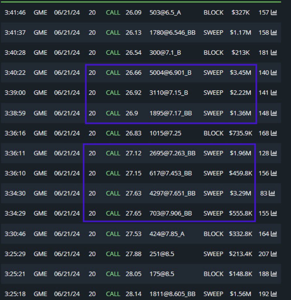 3 possible explanations for what happened to $GME 20$ strike call options maturing next week 👇🏻 So after the post below $GME 20$ strike calls maturing next week (the ones owned by @TheRoaringKitty ) started to trade in high volumes spreading fear he might be selling some of his positions and ultimately impacting the stock. Scenario 1: the above assumption is plausible, he cashed out some like pretty much any trader in his position would have done Scenario 2: E-Trade applied a positions limit on him and hence forced the selling, considering he used a retail account the broker can do this anytime Scenario 3: looking at the tape the volumes and trades look quite odd to me, as if someone started to trade the same options back and forth (aka wash trading) to attract attention there. Please have a look at the screenshot below, do you notice anything strange? Let me guide your eye here. 1 - After a “Block” trade at a certain price, 2 “Sweep” orders hits moving the HIGHER with 1 second gap - > That’s a buy 2 - ~1min 30 sec later another “Sweep” order hits moving the price LOWER - That’s a sell 3 - The dollar value of those trades above is very close, reason why I have more than one suspicion they can be “wash” ones 4 - Reason to “wash trade”? Well… it’s an illegal practice that can be deployed to inflate volumes and/or force an asset price to move up or down. Were 20$ strike calls “washed down” to spread fear among @TheRoaringKitty supporters and push the price lower? There is a chance and only a highly sophisticated institutional trader would have been able to pull that off…..