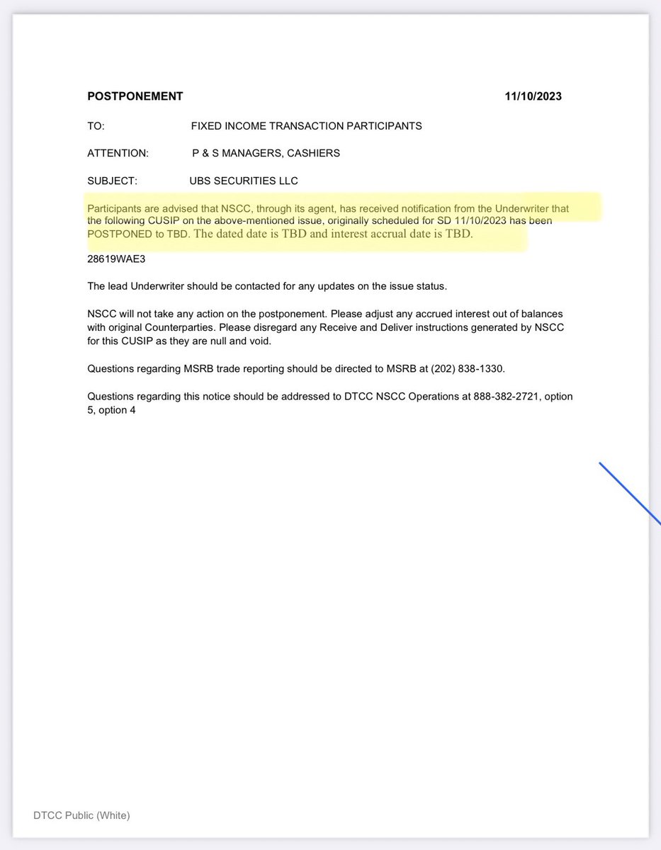 ⚠️ GOOD TRY #DTCC ! 😆⚠️ So the #DTCC changed the format of the “Issuer Failure” notice (like the one in the post below) to this “POSTPONEMENT EMAIL” Read the part highlighted in the pic🤦🏻♂️ Anyhow, a UBS SECURITIES LLC instrument failed to settle and when it will do it is “TBD” https://t.co/RDSWV0KdaL