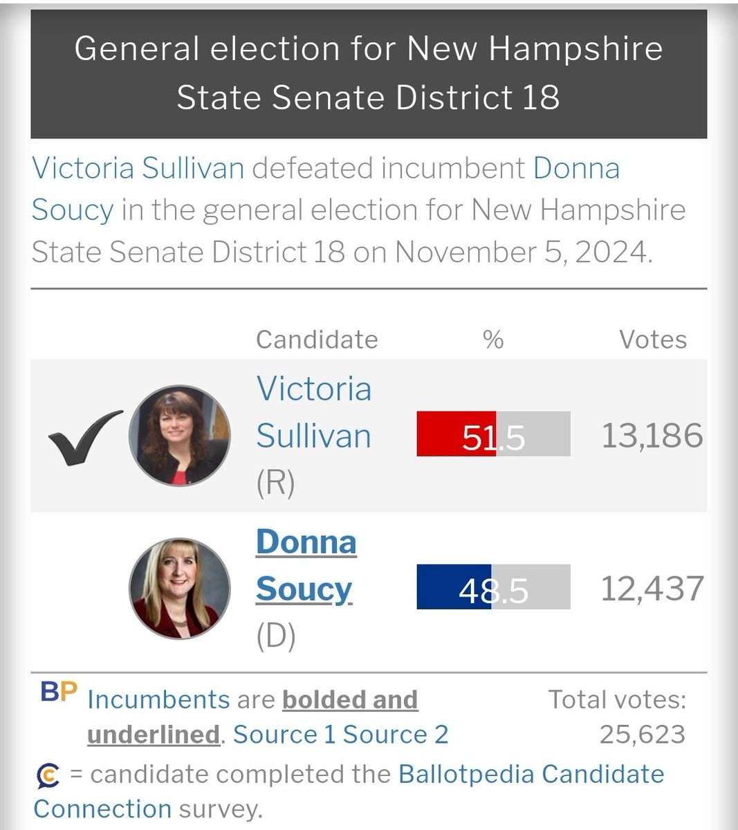The leader of the New Hampshire Senate Democrats lost her seat. Donna Soucy*: 48.5% 🔵 Victoria Sullivan: 51.5% 🔴 (+3) Donna was endorsed by the state affiliate of Randi Weingarten’s union. Victoria supports school choice. https://t.co/pwNjQfrdFq