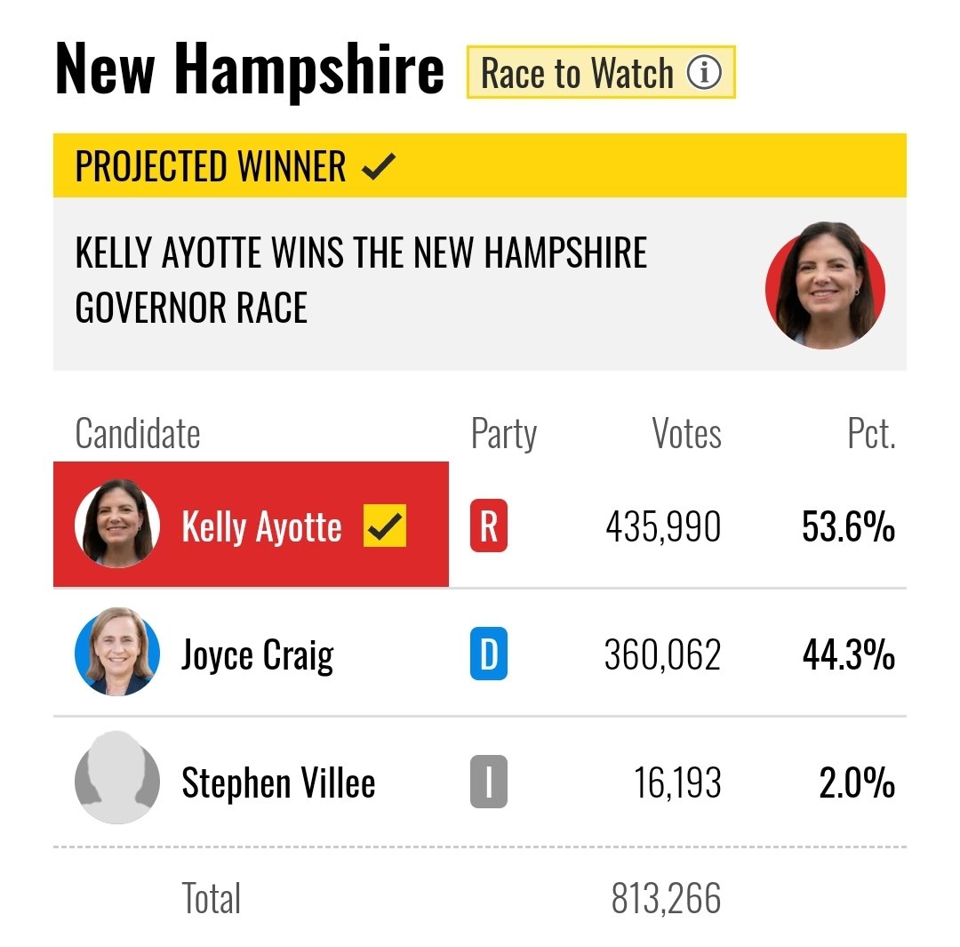 The next Republican Governor of New Hampshire, Kelly Ayotte, won her race by 9.3 points. @KellyAyotte supports UNIVERSAL school choice. Democrat Joyce Craig was endorsed by the teachers union and opposed school choice. It's time for New Hampshire to go all-in on school choice. https://t.co/thI54qpWnI