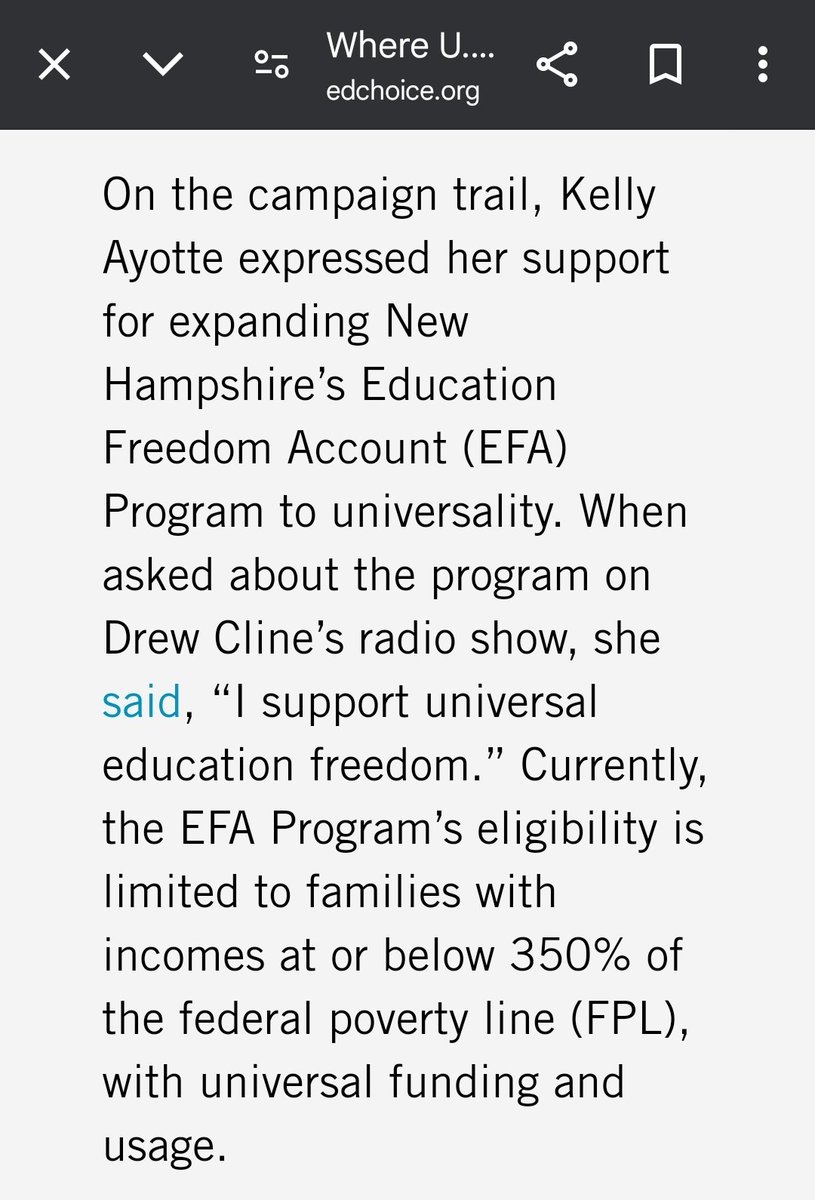 New Hampshire already has a school choice initiative. BUT it's limited to families with incomes at or below 350% of the poverty line. No more picking winners and losers. Governor-elect Kelly Ayotte: "I support universal education freedom." https://t.co/gCb8vGSoeD