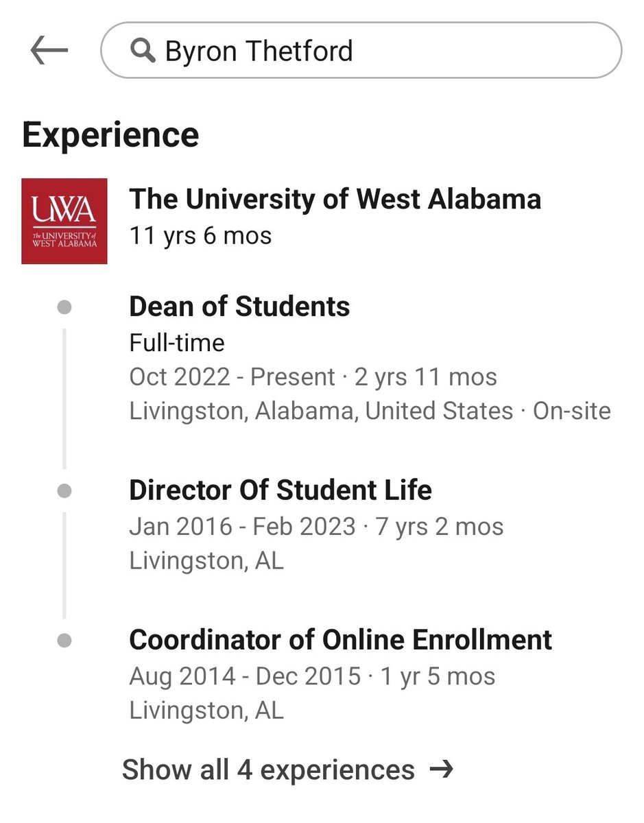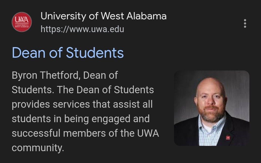 The Dean of Students at University of West Alabama (@univwestalabama) is Byron Thetford. He has been there for over 11 years.