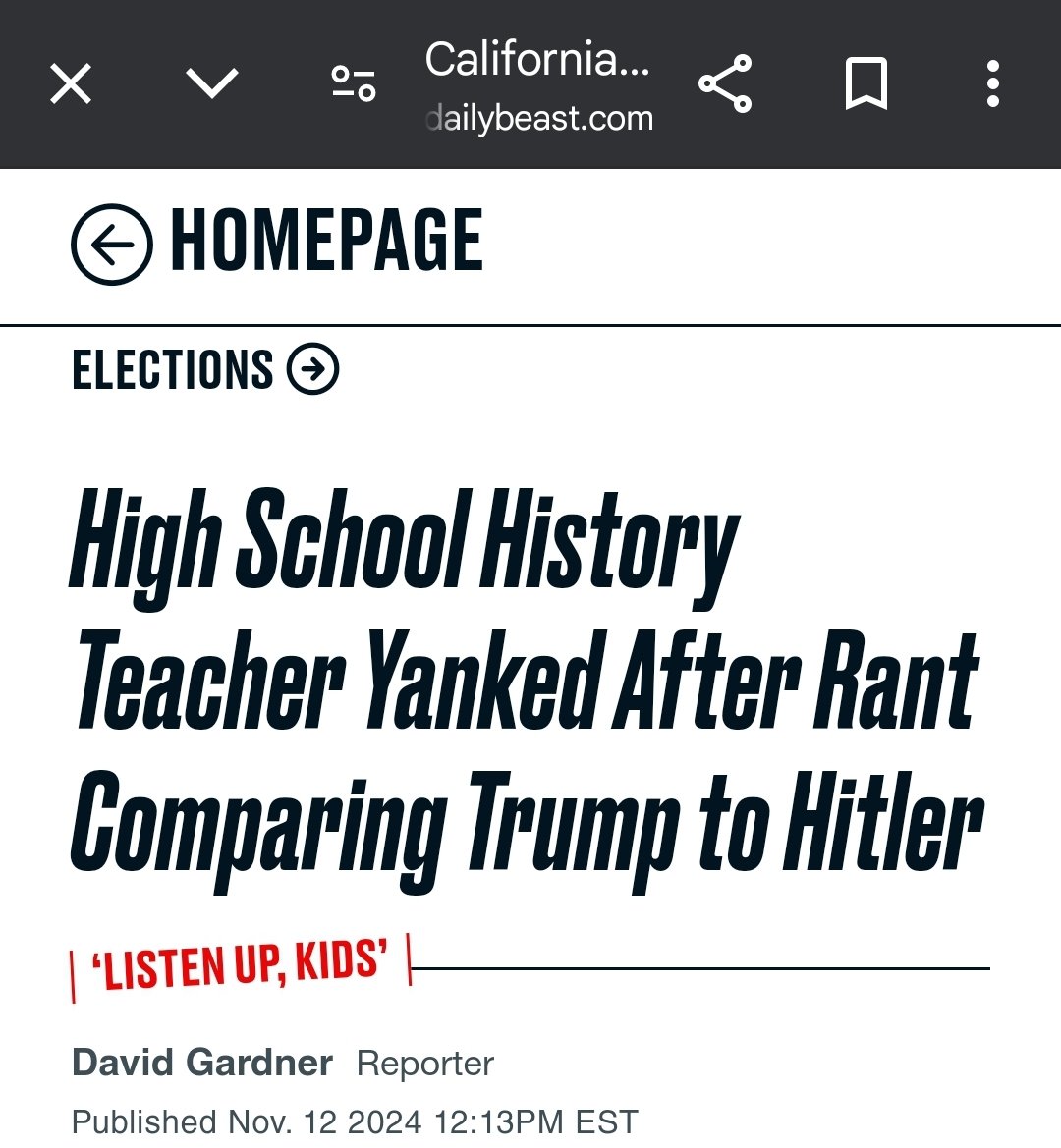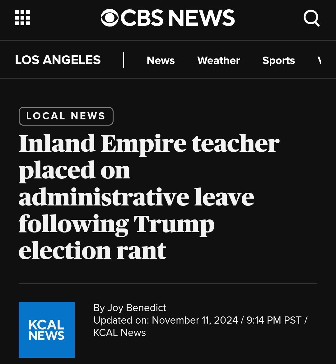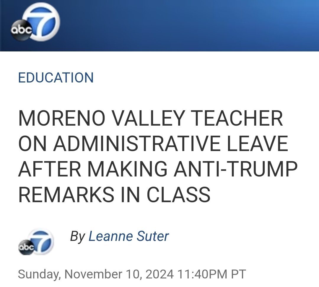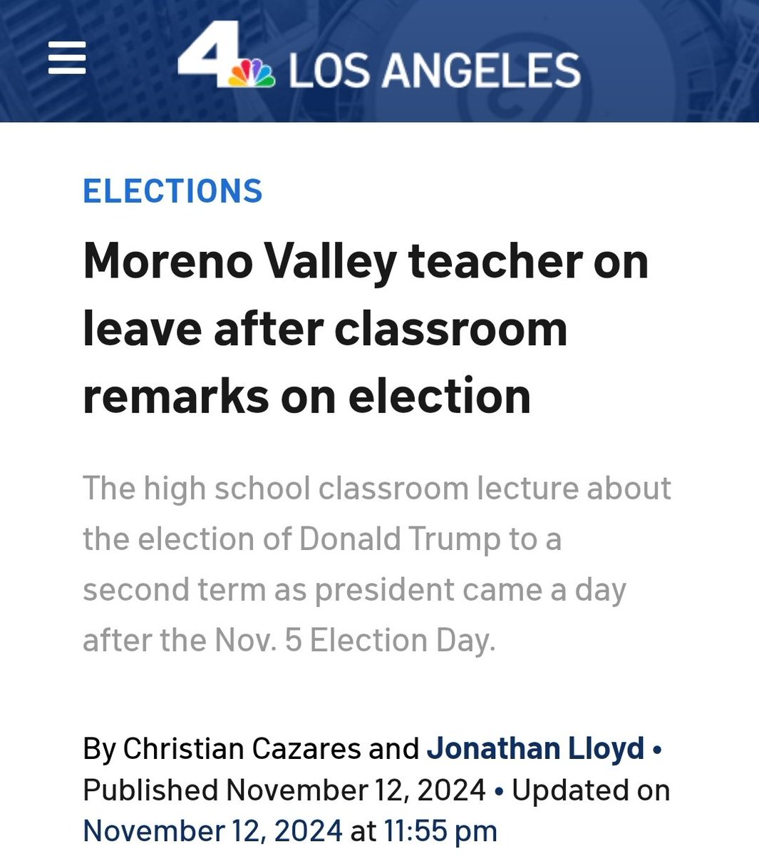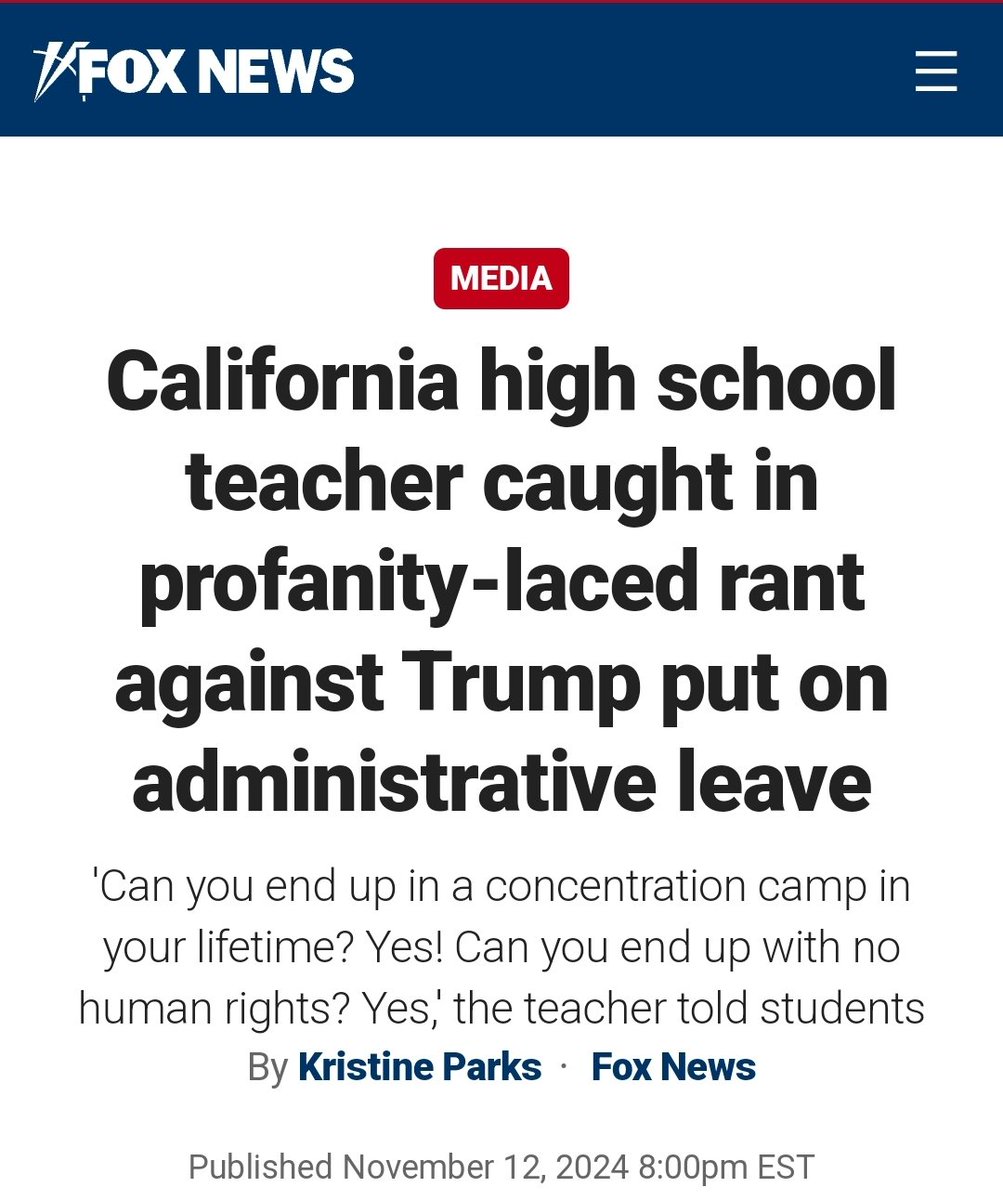 After my posts went viral Friday – viewed over 25 million times – this teacher's anti-Trump meltdown has already been covered outlets including Fox News, NBC, ABC, CBS, Los Angeles Times, Daily Mail, Blaze TV, Sky News, & The Daily Beast. X holds schools accountable, @elonmusk. https://t.co/u3zKyechtF