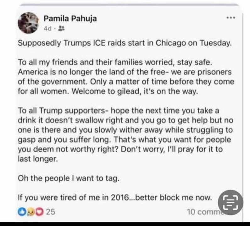 Here's the post from Pamila Pahuja who wished "all Trump supporters" would choke and suffer a slow death. "I'll pray for it to last longer." https://t.co/08PYCDd3KR