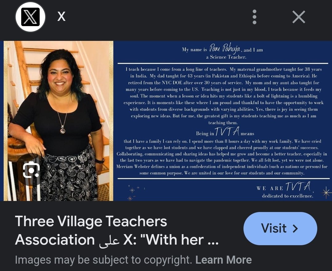 The teachers union posted, "Pamila Pahuja is a true gem to the Three Village CommUNITY!" https://t.co/FXuITp0y5H