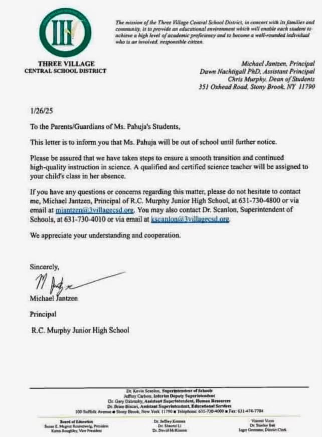 The principal sent out this letter about the teacher yesterday. "Ms. Pahuja will be out of school until further notice." https://t.co/0AC4AVb3a5
