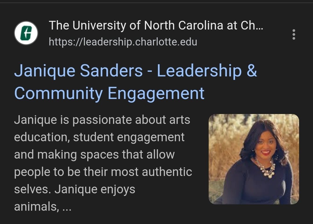 The University of North Carolina - Charlotte administrator is Janique Sanders. She is their assistant director of leadership and community engagement. https://t.co/II2HGHRLhI