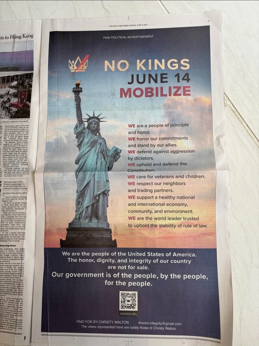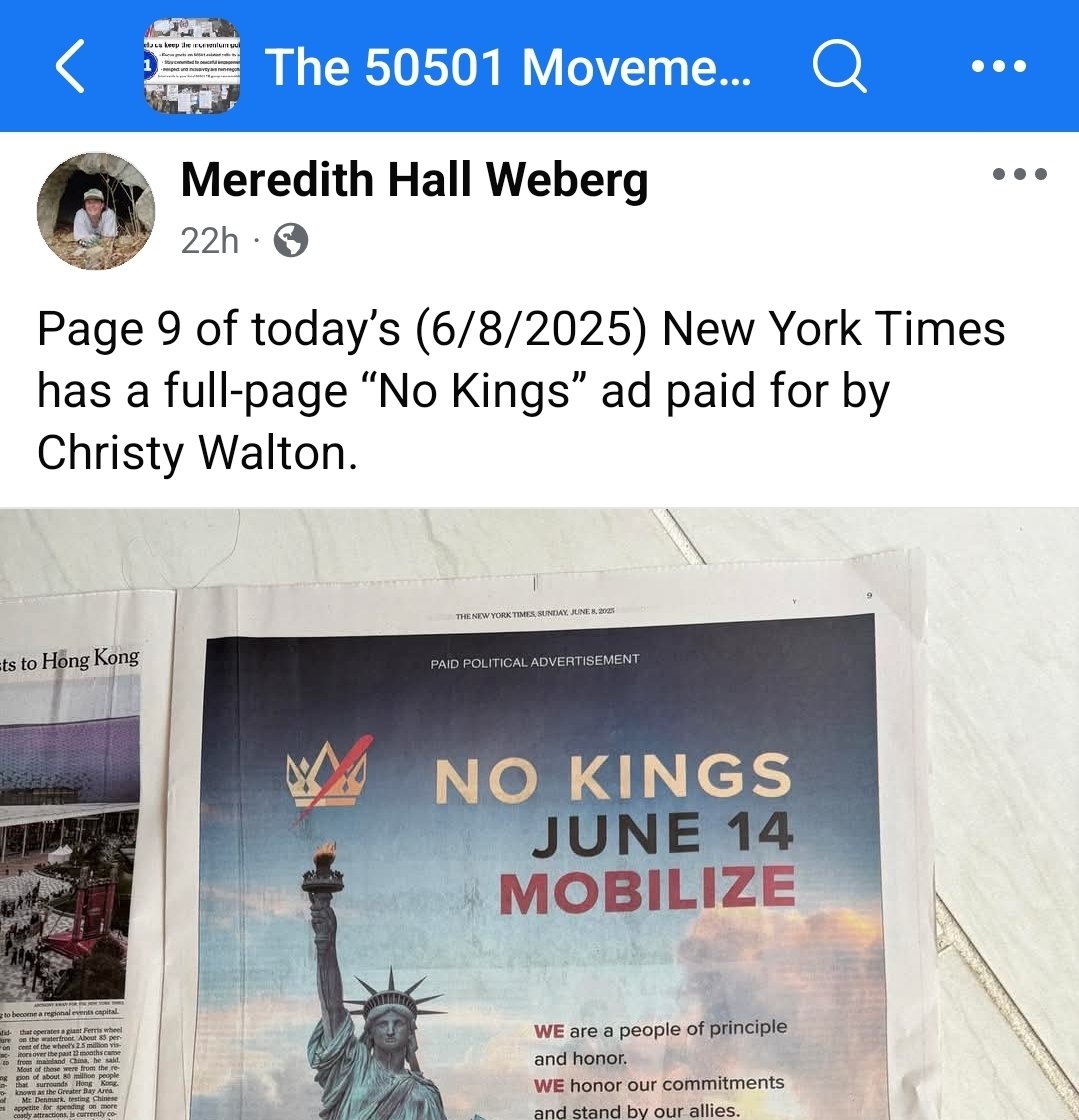 Christy Walton paid for this political advertisement against Trump in major newspapers nationwide. The event calls for "a nationwide day of defiance" and for people to "rise up" on June 14th. She is a Walmart heiress. https://t.co/axVLdMdFS4