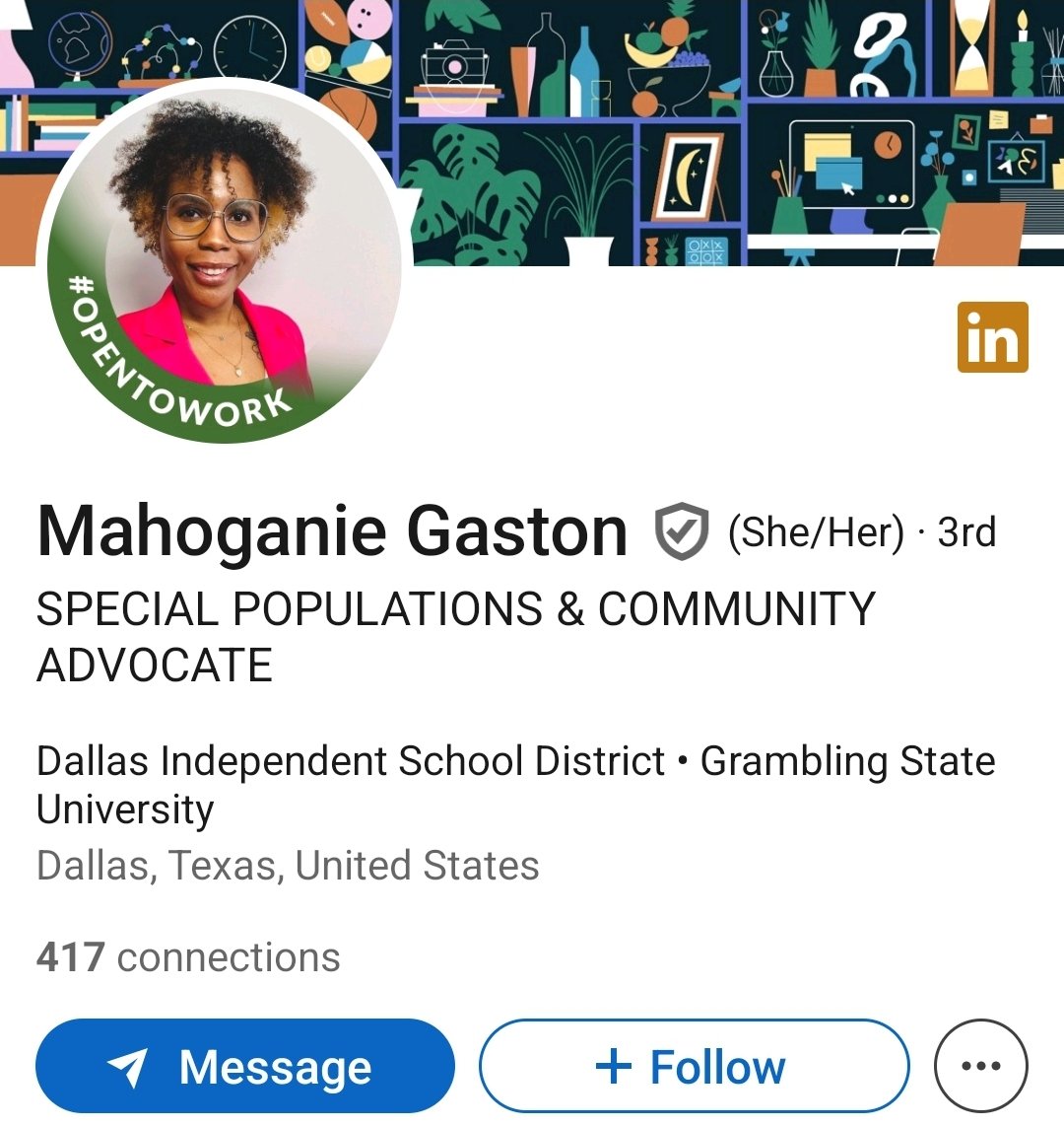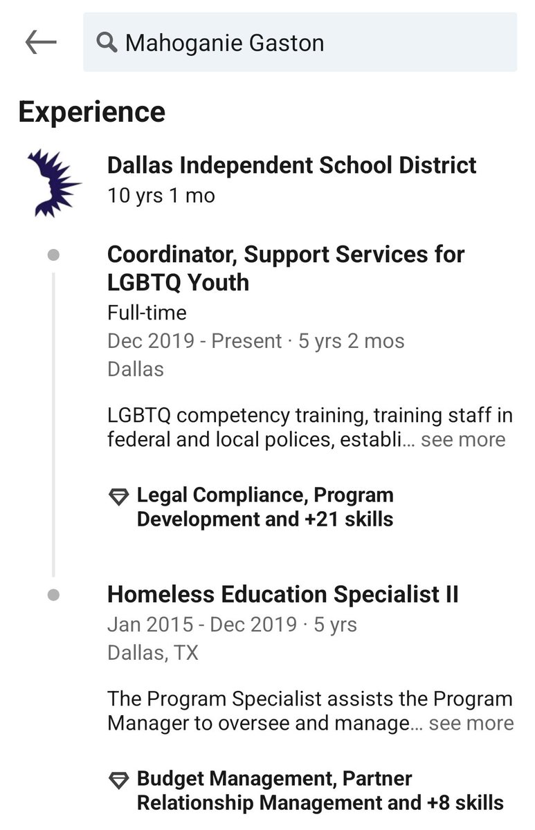 The public school official caught by the undercover journalists is Mahoganie Gaston. Here is her LinkedIn. She has worked at Dallas ISD for 10 years. https://t.co/Jke8IhvYBI