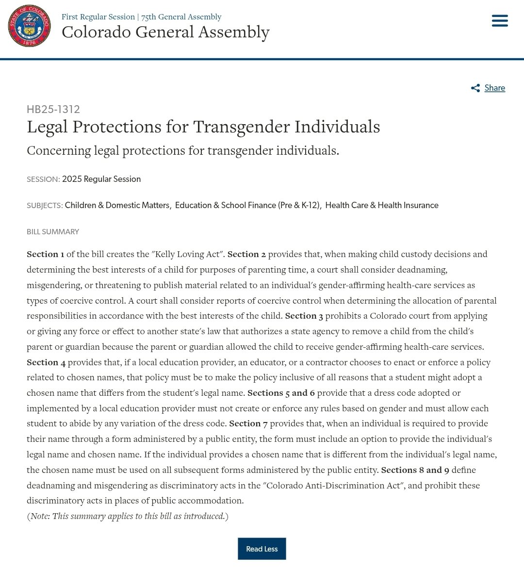 Colorado House Bill 25-1312: "Legal Protections for Transgender Individuals" https://t.co/ObUsePd8z9