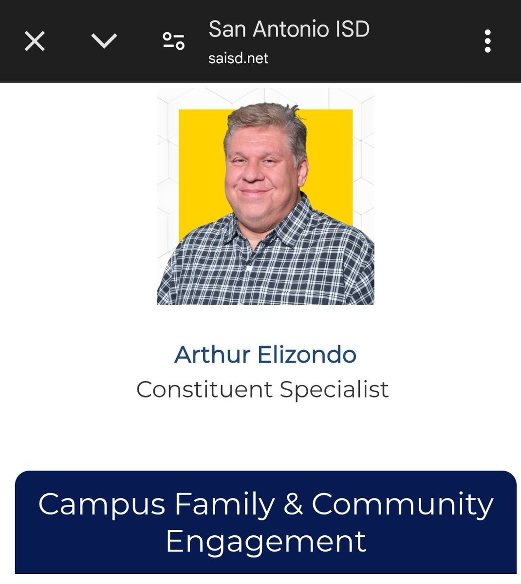 The school district administrator is Arthur Elizondo. He is a constituent specialist at the Office of Family and Community Engagement. He works at San Antonio ISD in Texas (@SAISD). https://t.co/TBcR2bk6f7