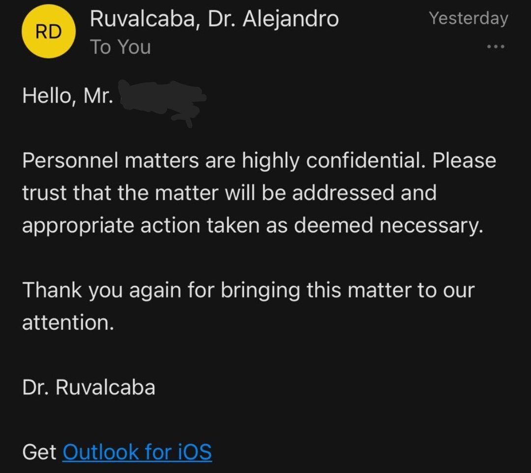 I just obtained an email from the @MorenoValleyUSD Superintendent Alejandro Ruvalcaba to a parent "Personnel matters are highly confidential. Please trust that the matter will be addressed and appropriate action taken as deemed necessary." Just trust they'll do the right thing? https://t.co/EFvC7B1pc5