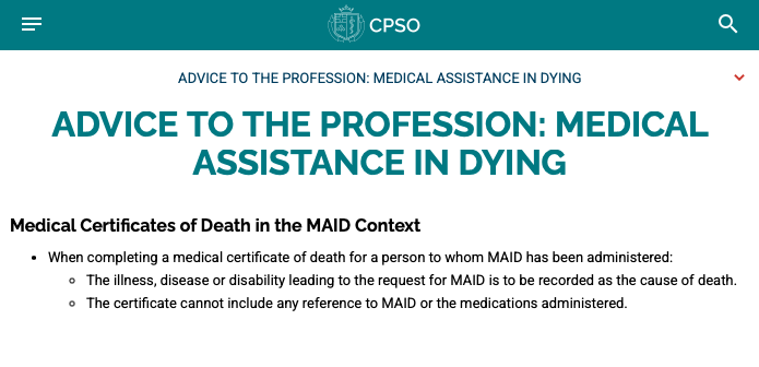 Ontario doctors are under orders to lie on your death certificate. Not shade the truth. Lie. Here it is. Official. In writing. From the College of Physicians and Surgeons of Ontario. "The illness, disease or disability leading to the request for MAID is to be recorded as the cause of death. The certificate cannot include any reference to MAID or the medications administered." Source: CPSO: Medical Certificates of Death in the MAID Context