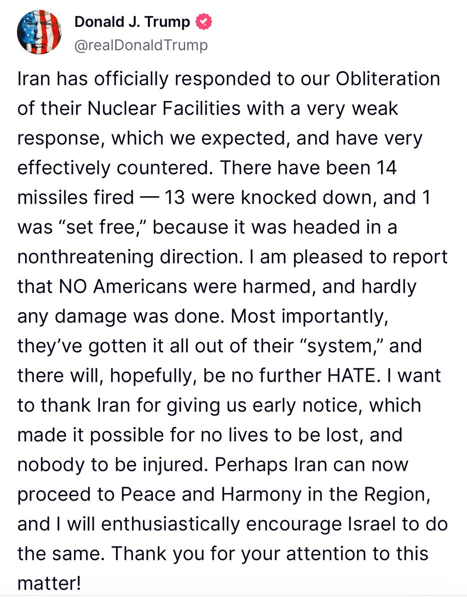 Destroyed nuclear facilities, no dead Americans and no forever war with Iran seems like a big win to me. My father was never looking to plunge us into a prolonged conflict and those of us who know him best knew all along that his endgame was peace. America First! https://t.co/SUBpJ81GdS