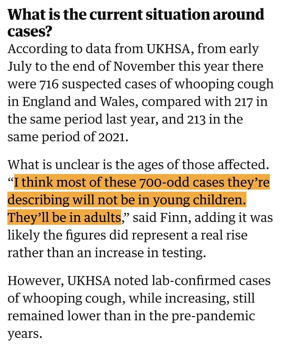 The NHS is currently running a campaign to try to guilt parents into thinking vax refusal is leading to a whooping cough epidemic in kids. This is a lie. It's mainly in adults. https://theguardian.com/society/2023/dec/09/what-is-whooping-cough-and-why-are-cases-rising-in-england-and-wales https://cks.nice.org.uk/topics/whooping-cough/background-information/prevalence/#:~:text=In%20children%20aged%20between%201,in%202021%20and%202020%2C%20respectively….
