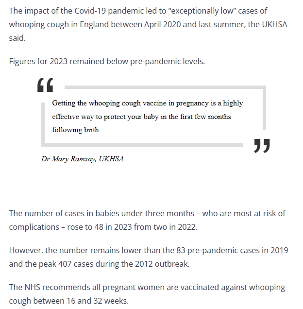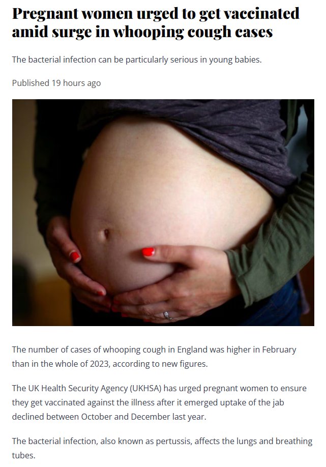 Lies. Their own article contradicts them🤡 *** Pregnant women urged to get vaccinated amid surge in whooping cough cases https://guernseypress.com/news/uk-news/2024/04/05/pregnant-women-urged-to-get-vaccinated-amid-surge-in-whooping-cough-cases/