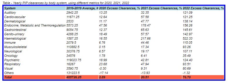 UK Disabilities (PIP) Project We analyze claims cleared by Body System then by Underlying Causes. Can Doctors & Health authorities please explain these findings? It’s a crisis of epic proportions. Total Body System findings summarized by % increase & z-score versus pre 2020 trend https://phinancetechnologies.com/HumanityProjects/Projects.htm