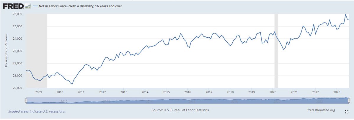 Disability Not in Labor Force 16 & over is up 1 million from pre 2020 high. Or 5.7%. This category is available to work and willing to work. So the unemployed have the least amount of increase in disability since 2020…very curious 🧐 🤔 https://t.co/jdh7pWGbGV