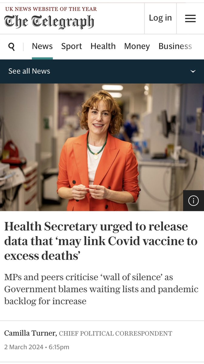 BREAKING: Health secretary urged to release data that may link covid vaccine to excess deaths It’s finally breaking the mainstream. The truth is like a lion. You don’t have to defend it. Let it loose and it will defend itself … 🔥🔥🔥 https://www.telegraph.co.uk/news/2024/03/02/health-secretary-release-data-covid-vaccine-excess-deaths/