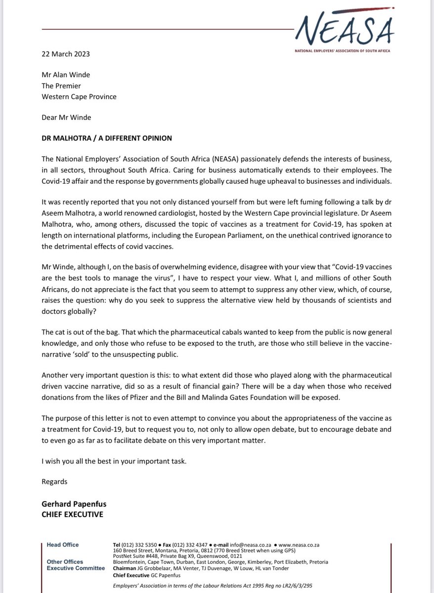 Extraordinary letter from the CEO of National Employers Association of South Africa ( NEASA) to the Premier of the Western Cape @alanwinde that smashes the establishment narrative on the mRNA covid vaccines ‘ The cat is out of the bag. That which the pharmaceutical cabals…
