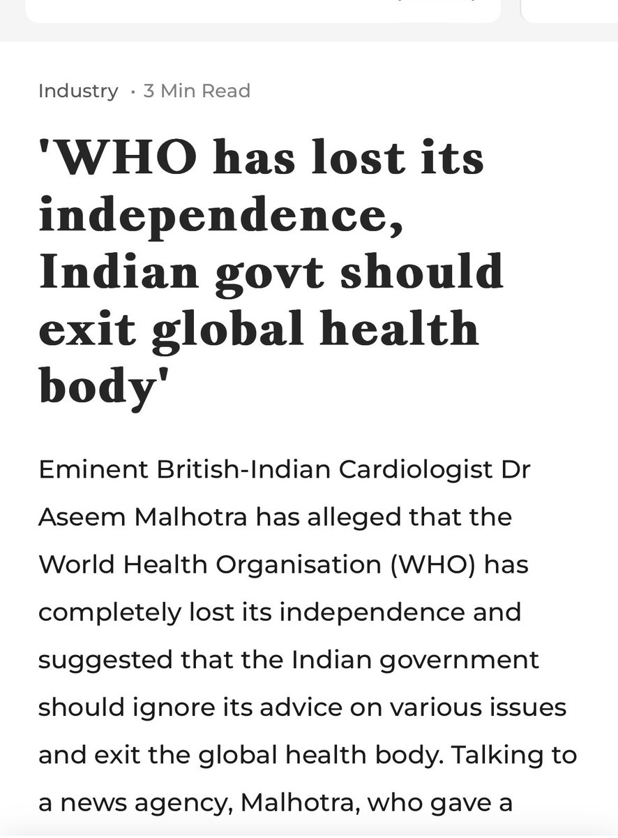 BREAKING NEWS TIMES OF INDIA 🔥 Indian government told to exit the WHO ‘As long as the WHO is getting industry funding or funding from vested interests, it should not be considered independent and the Indian government should ignore its advice Those commercial entities are not interested in your health, they will make money by deception’ ALSO "Drug regulators, such as the FDA, who are supposed to evaluate drugs, receive 65 per cent of their funding from big pharma. The regulator in the UK gets 86 per cent funding from the pharma companies. So this is a gross conflict of interest. Patients and doctors think these organisations are independently evaluating the data, but they are not doing that. Till we remove these commercial conflicts of interest from health policies and decision making, we are not going to progress," Malhotra said https://health.economictimes.indiatimes.com/amp/news/industry/who-has-lost-its-independence-indian-govt-should-exit-global-health-body/105681162