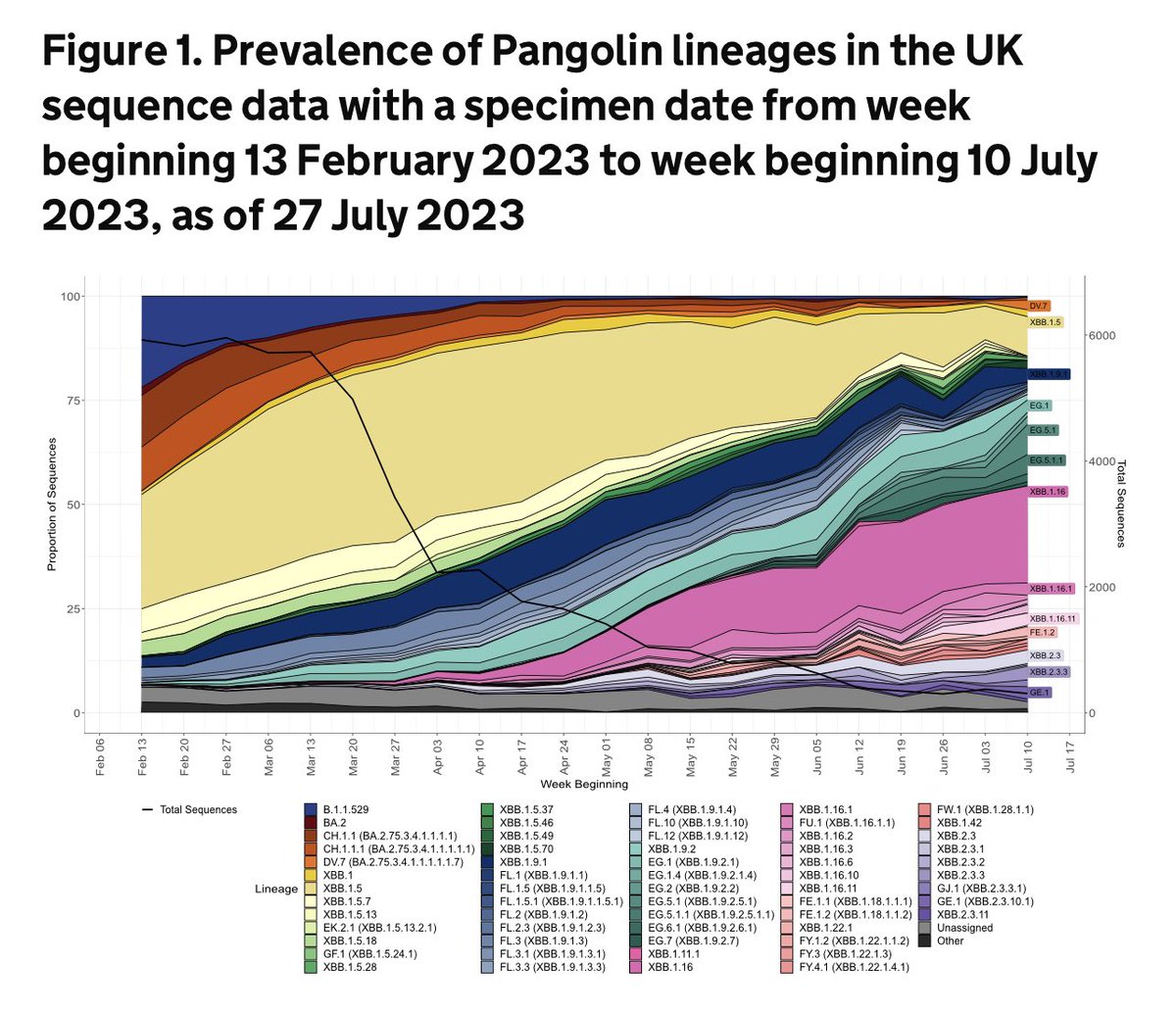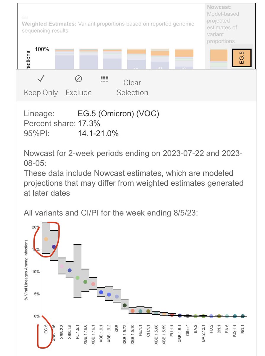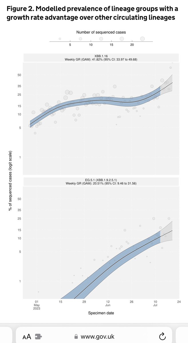 4) UK’s variant modeling group shows both XBB16 and EG5 growing simultaneously and fighting for dominance. However Us CDC predicts XBB16 likely waning. Why the divergence? When folks can’t agree on any spiking trajectory, it gives me pause if this is “the next big one” or not. https://gov.uk/government/publications/sars-cov-2-genome-sequence-prevalence-and-growth-rate/sars-cov-2-genome-sequence-prevalence-and-growth-rate-update-2-august-2023